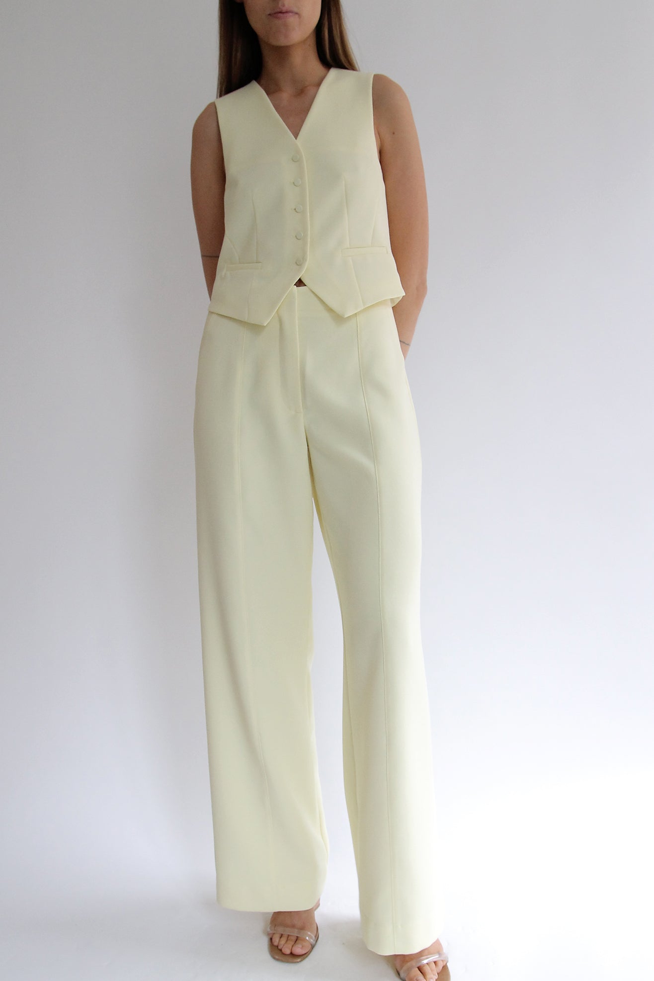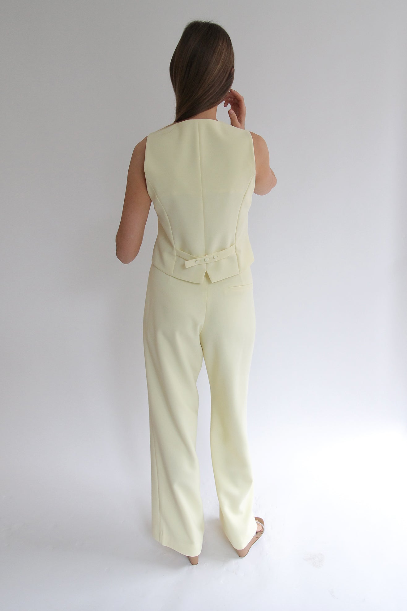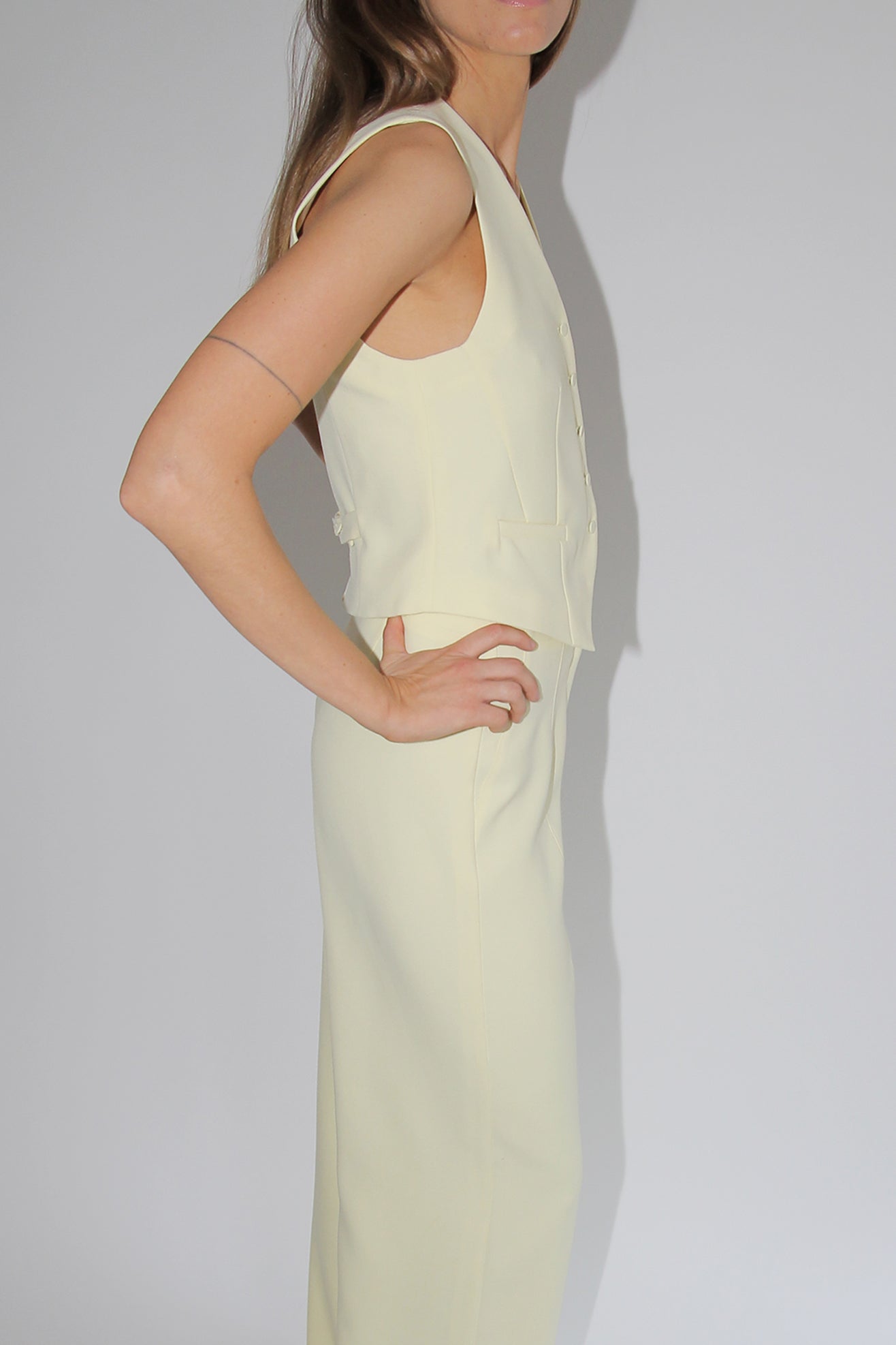 Sleeveless, vest top in butter yellow poly blend suiting from deadstock fabric. Low V-neck with fabric covered buttons at front placket. Two double welt pockets at hip. Fully lined