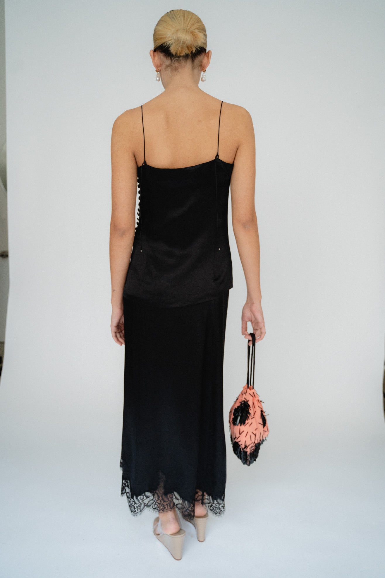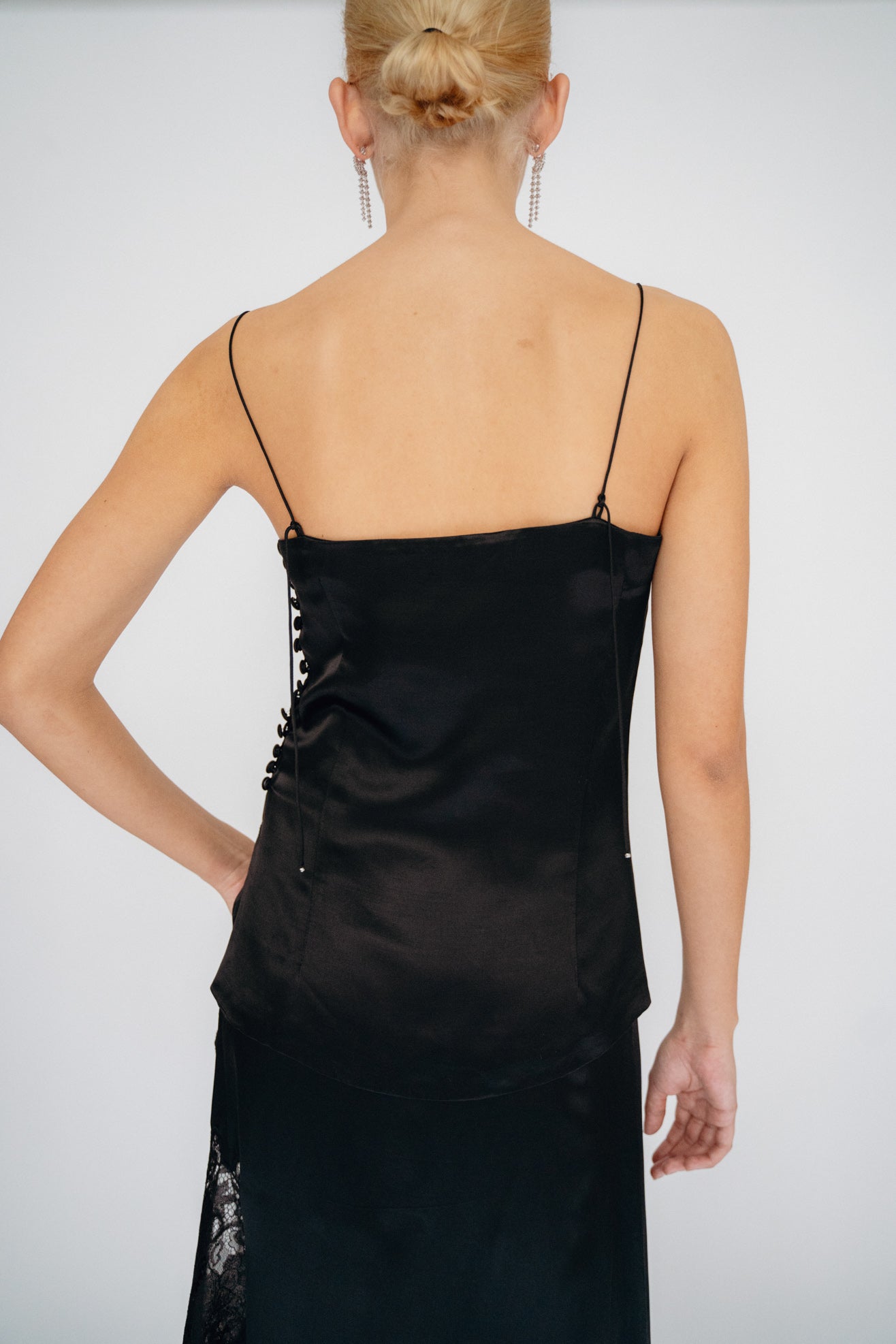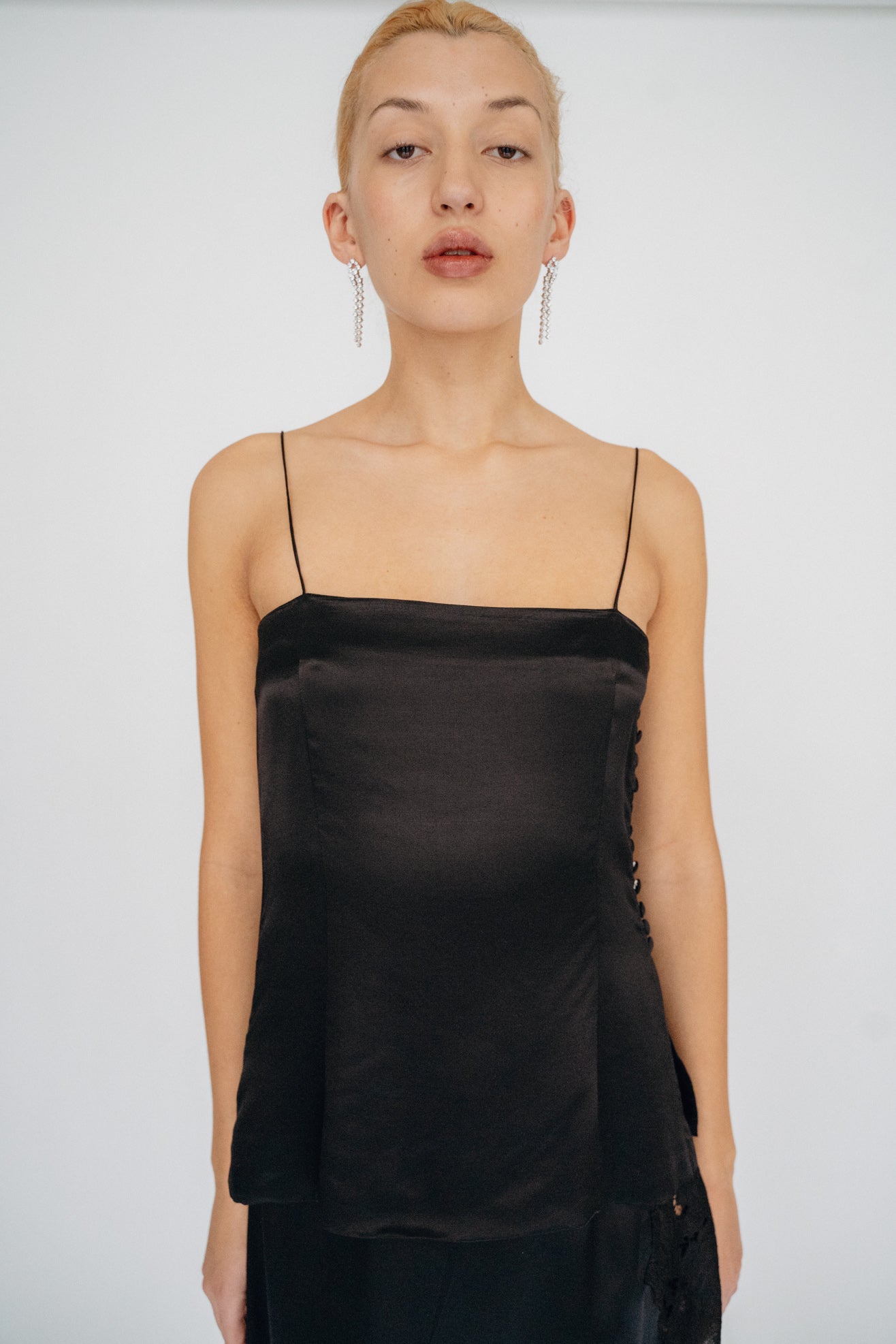 Fitted camisole in black viscose satin with super fine adjustable spaghetti straps with rhinestone finish. Functional fabric-covered button closures at side seam. Lined with delicate crepe lining.
