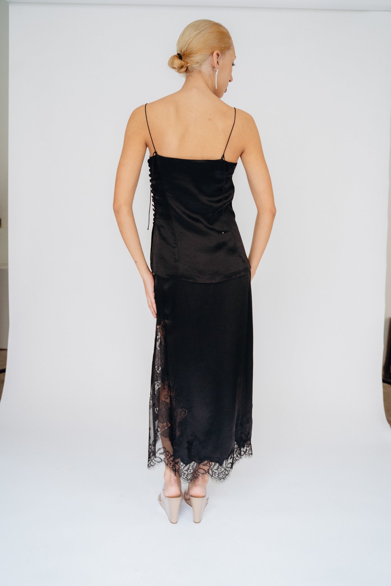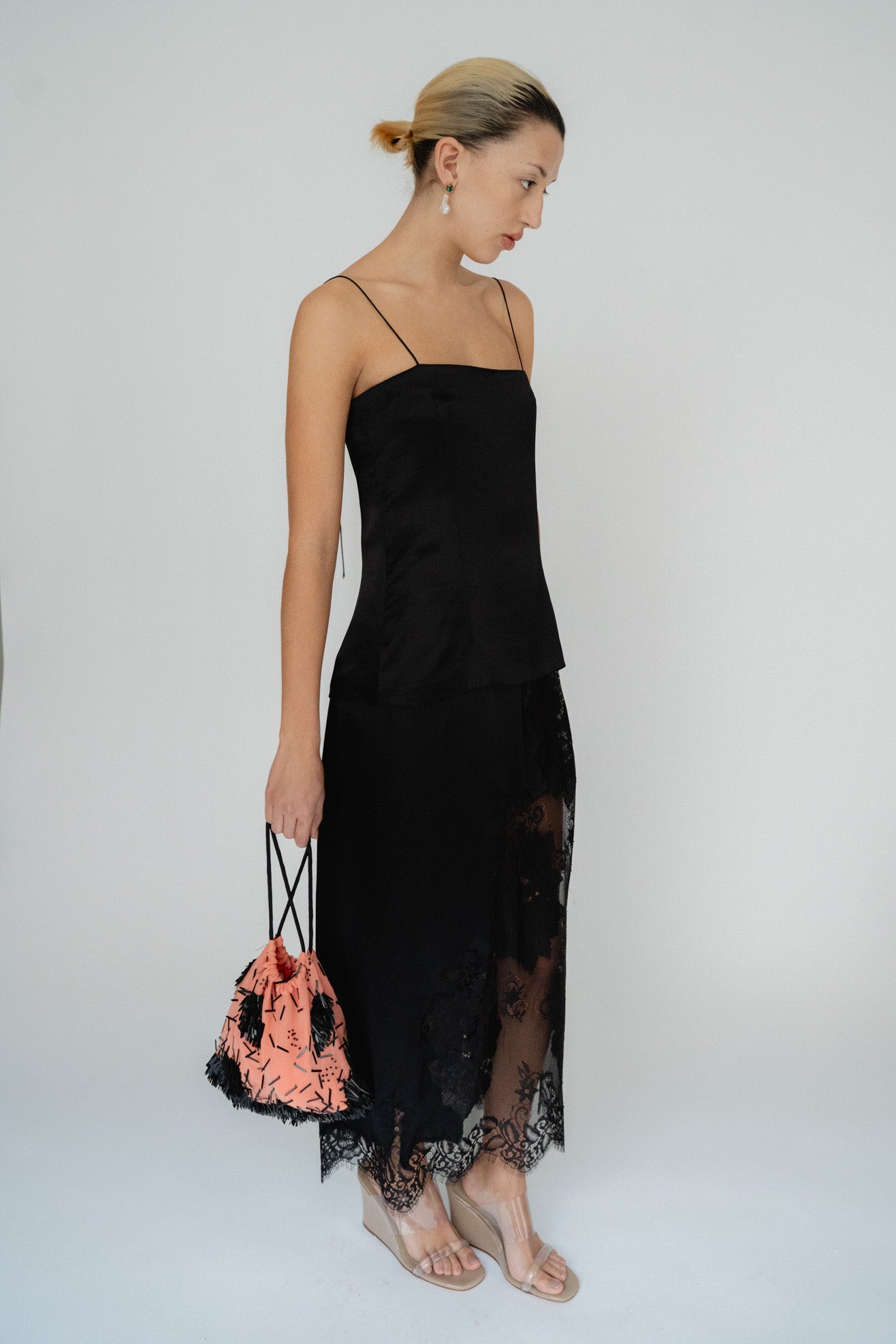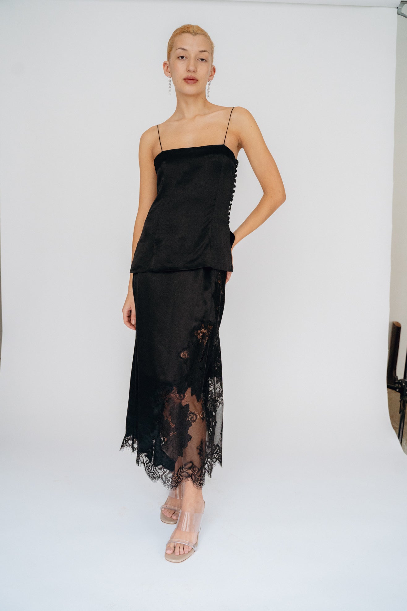 Fitted camisole in black viscose satin with super fine adjustable spaghetti straps with rhinestone finish. Functional fabric-covered button closures at side seam. Lined with delicate crepe lining.
