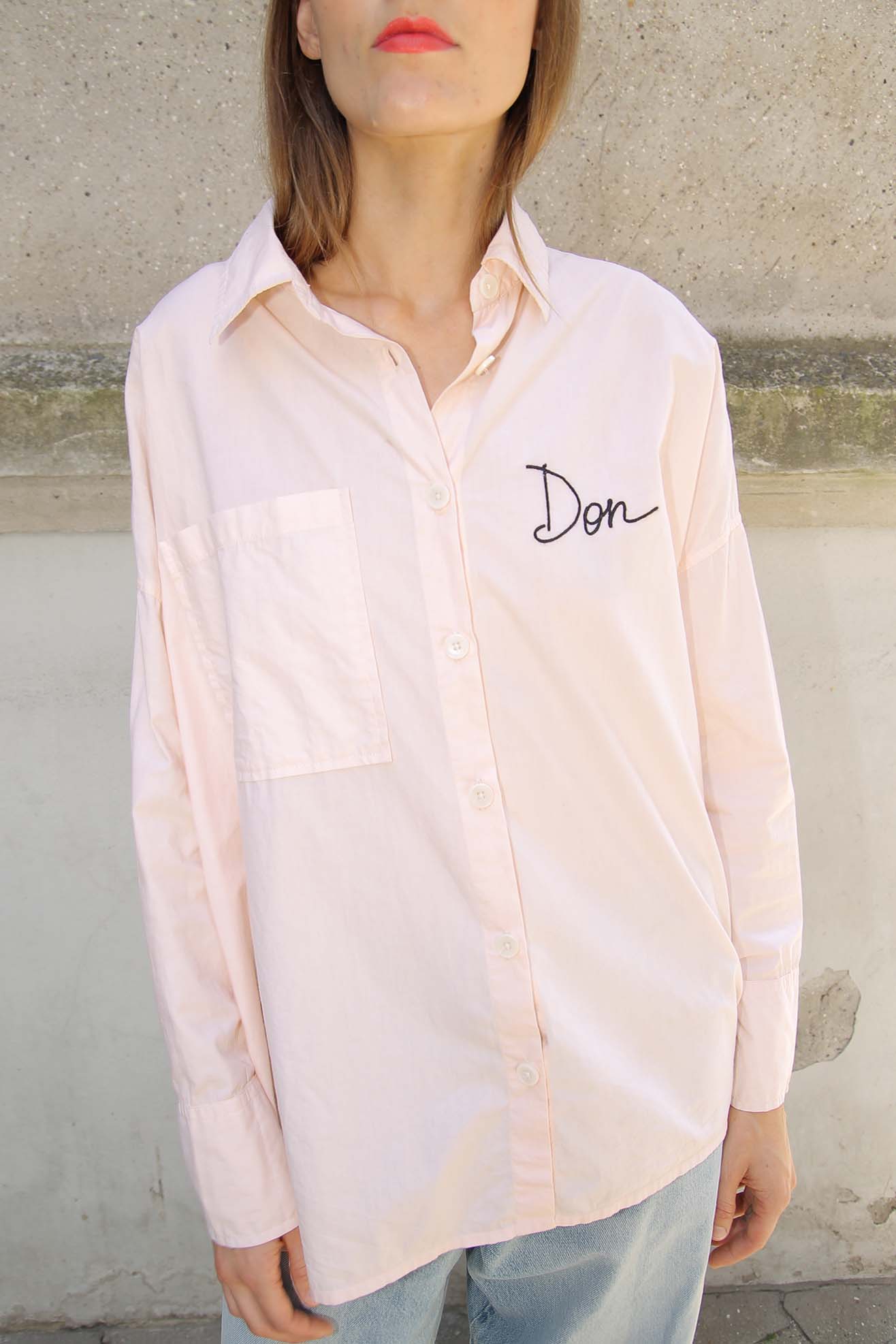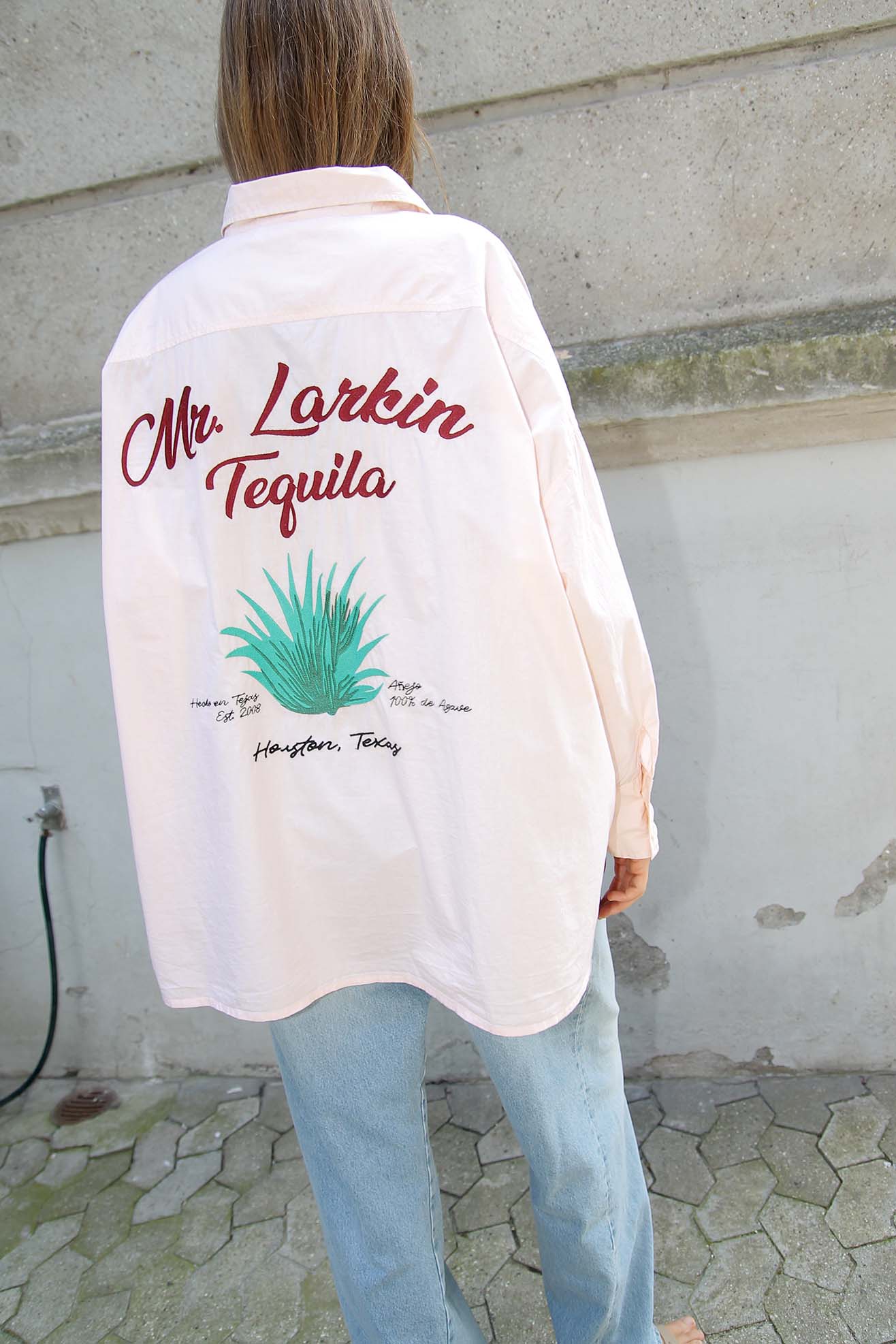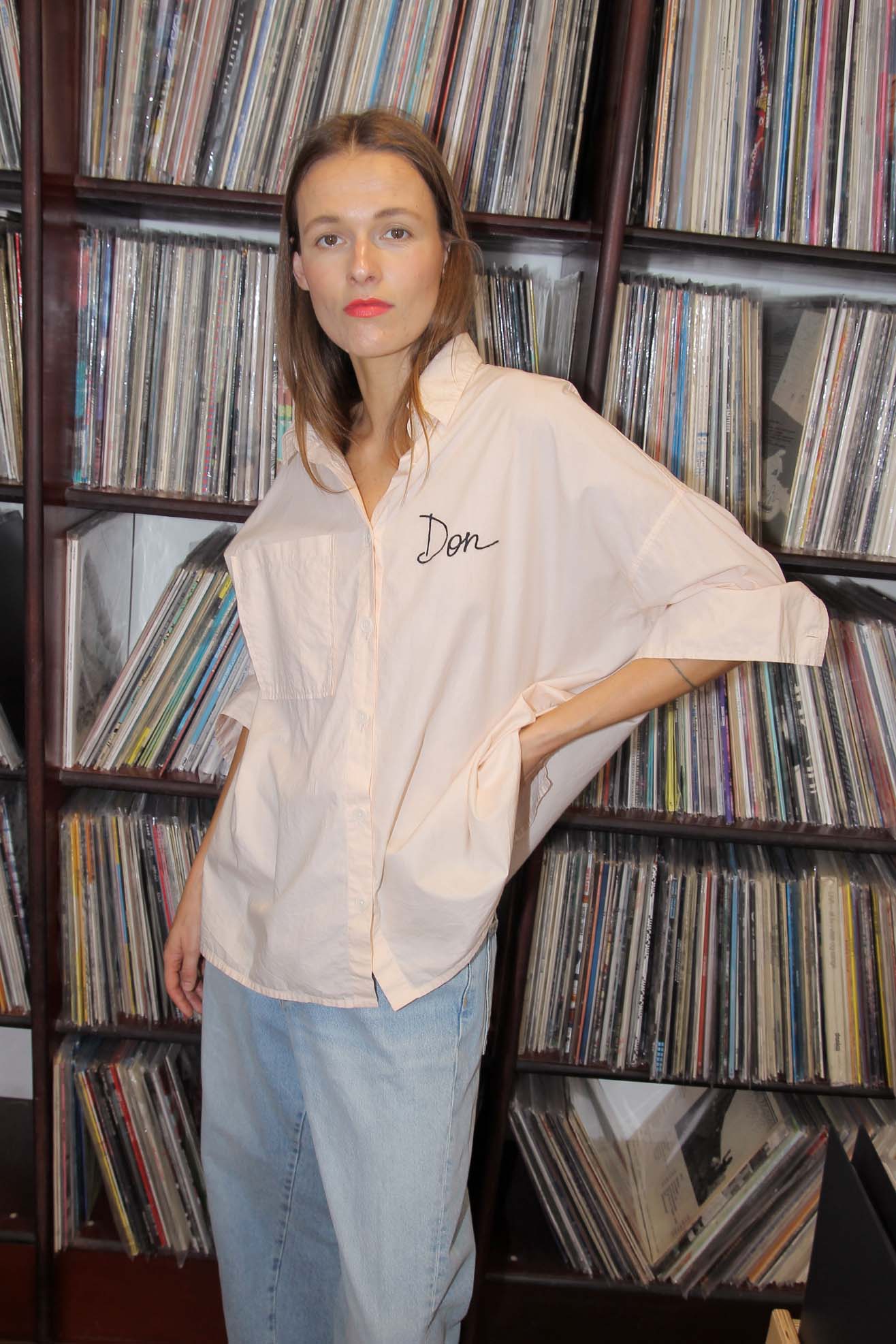 Our take on the retro uniform shirt celebrating our two store location. Oversized boyfriend shirt with embroidery at front chest and full back. Made from a soft paled peach organic cotton poplin. Front embroidery name "Don" embroidered at front chest. Back embroidery "Mr. Larkin Tequila". Shirt collar. Full length, cuffed sleeves. Front button placket with contrasting off white buttons. Straight hem with back longer than front.