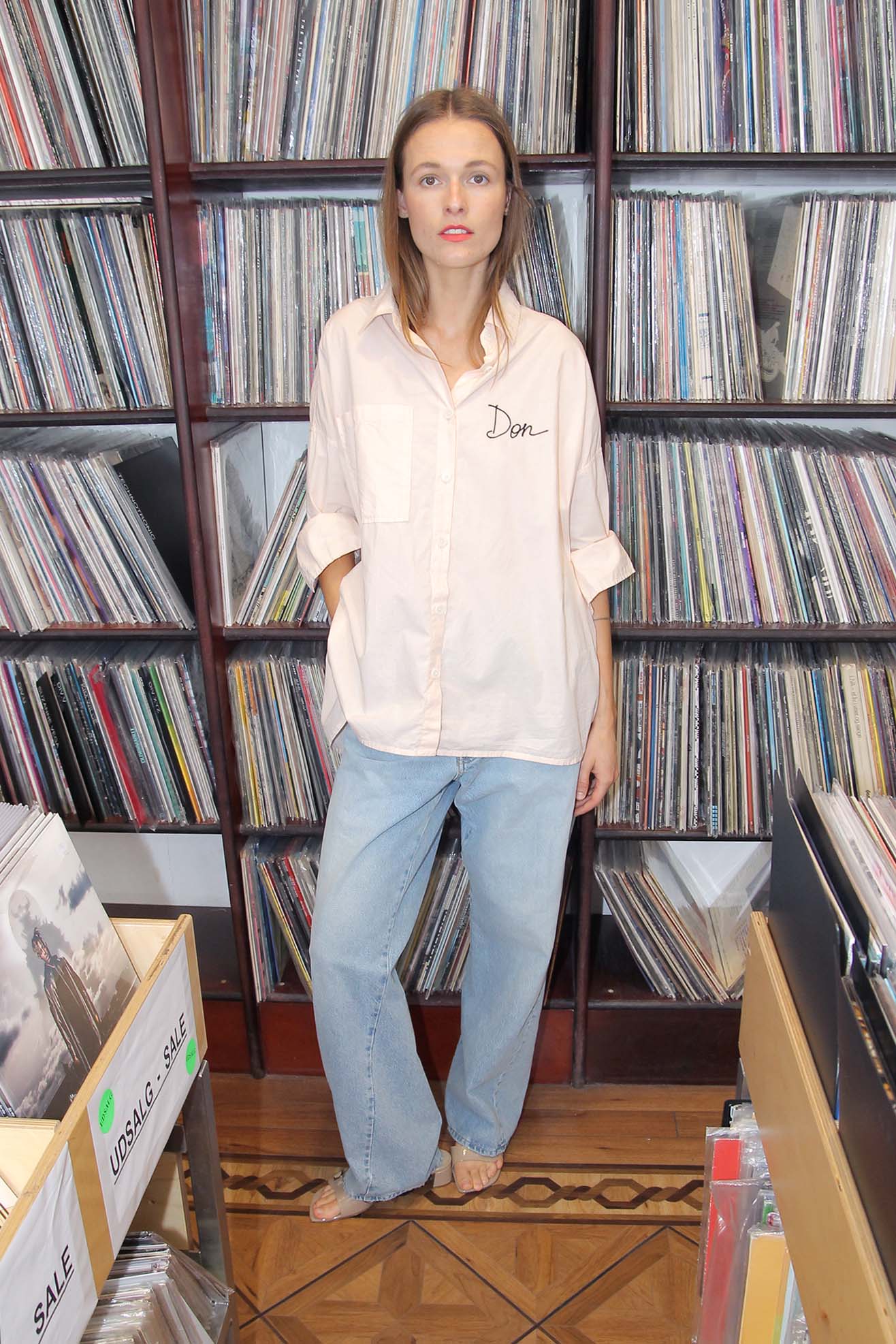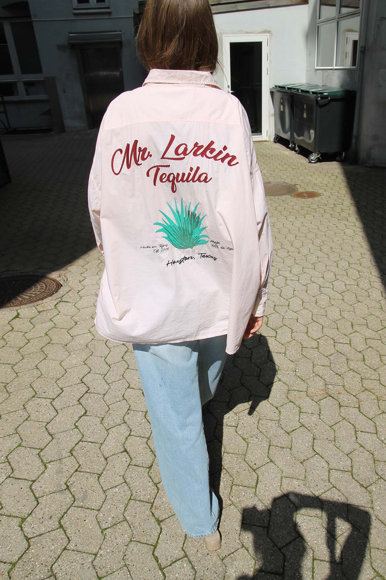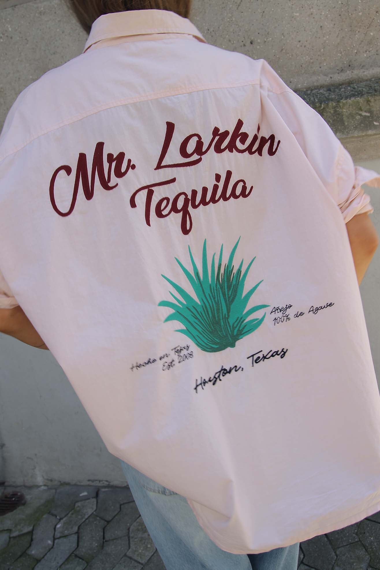 Our take on the retro uniform shirt celebrating our two store location. Oversized boyfriend shirt with embroidery at front chest and full back. Made from a soft paled peach organic cotton poplin. Front embroidery name "Don" embroidered at front chest. Back embroidery "Mr. Larkin Tequila". Shirt collar. Full length, cuffed sleeves. Front button placket with contrasting off white buttons. Straight hem with back longer than front.