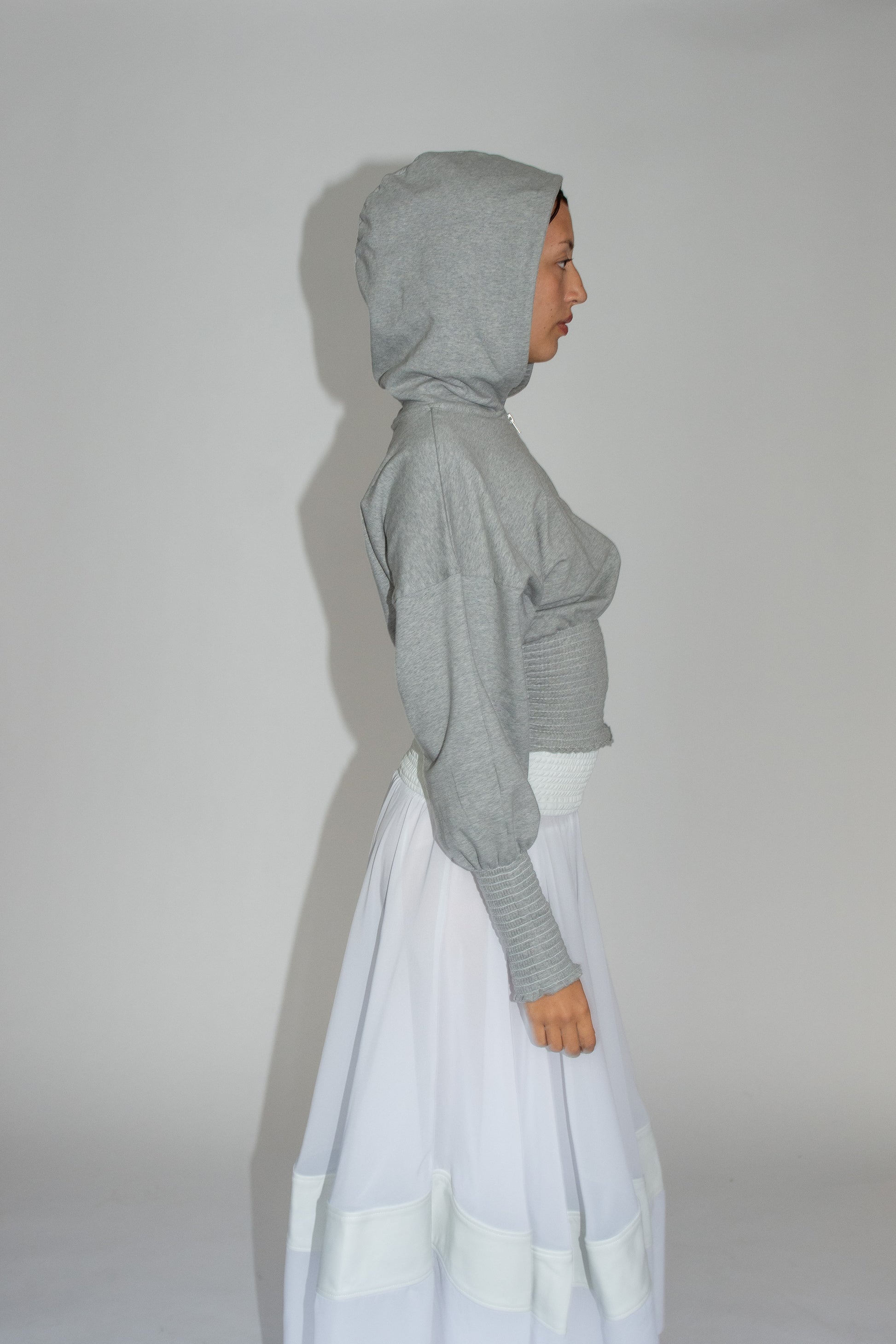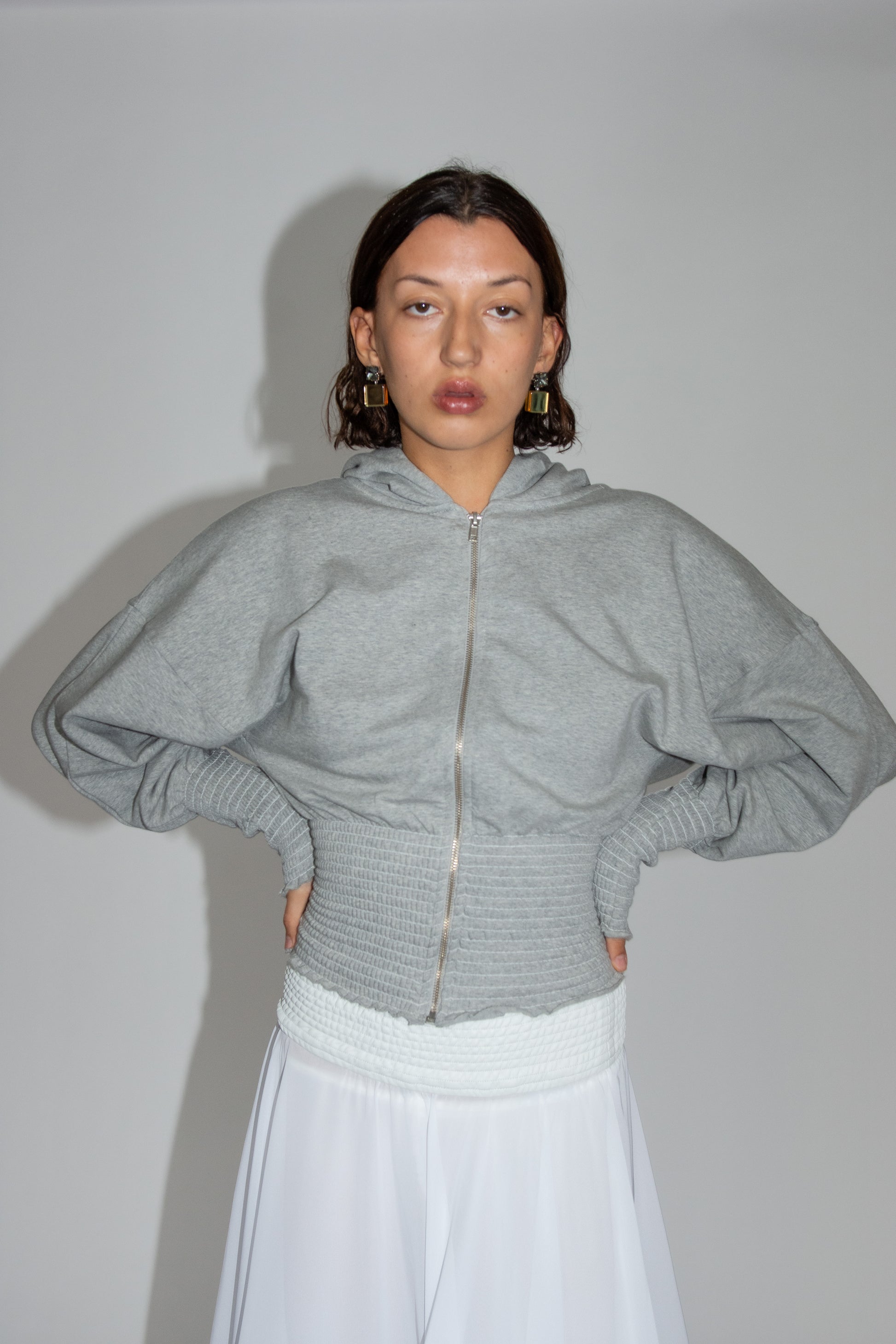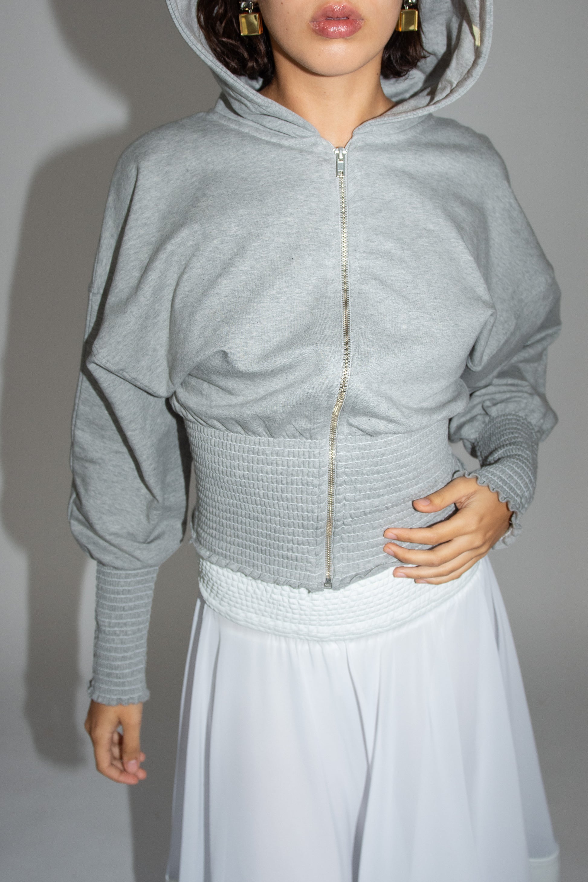 Grey hoodie crafted from a soft cotton and elastane blend. Features voluminous sleeves and a cinched, smocked waist. Front zip closure and hood. Cropped fit. Raw hem. Unlined.