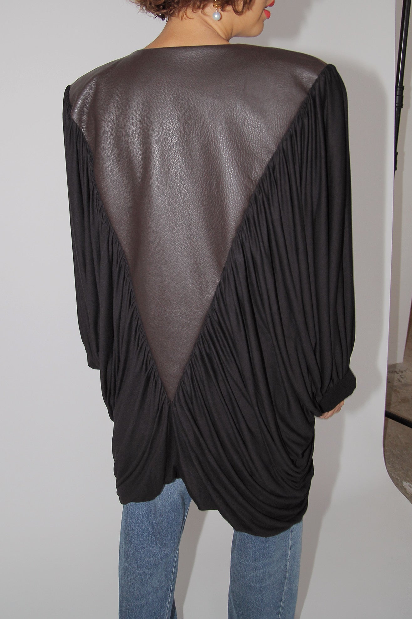 Black draped jersey dress with deep V panel made in brown leather. Centered metal push buttons. Bat sleeves. Partially lined. Hits above knee. Lightly pattered shoulders.