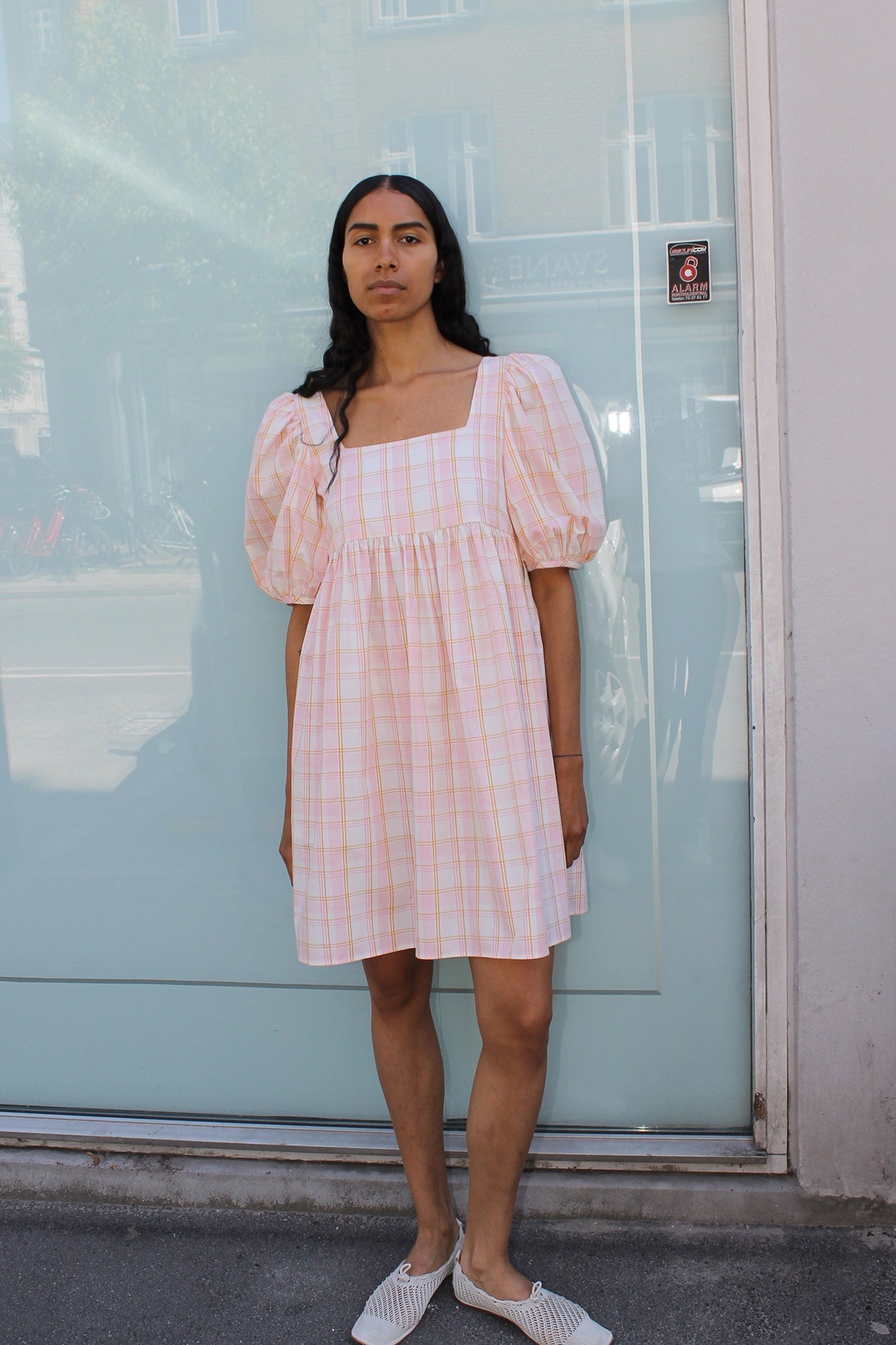 Babydoll mini dress in a pink plaid cotton. Square neckline with elbow length puffed sleeves. Empire waistline. Side seam pockets. Fully lined.