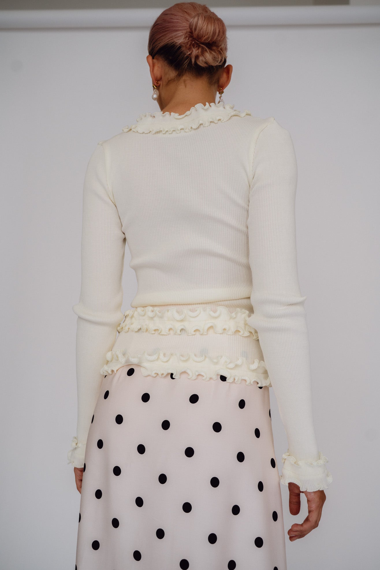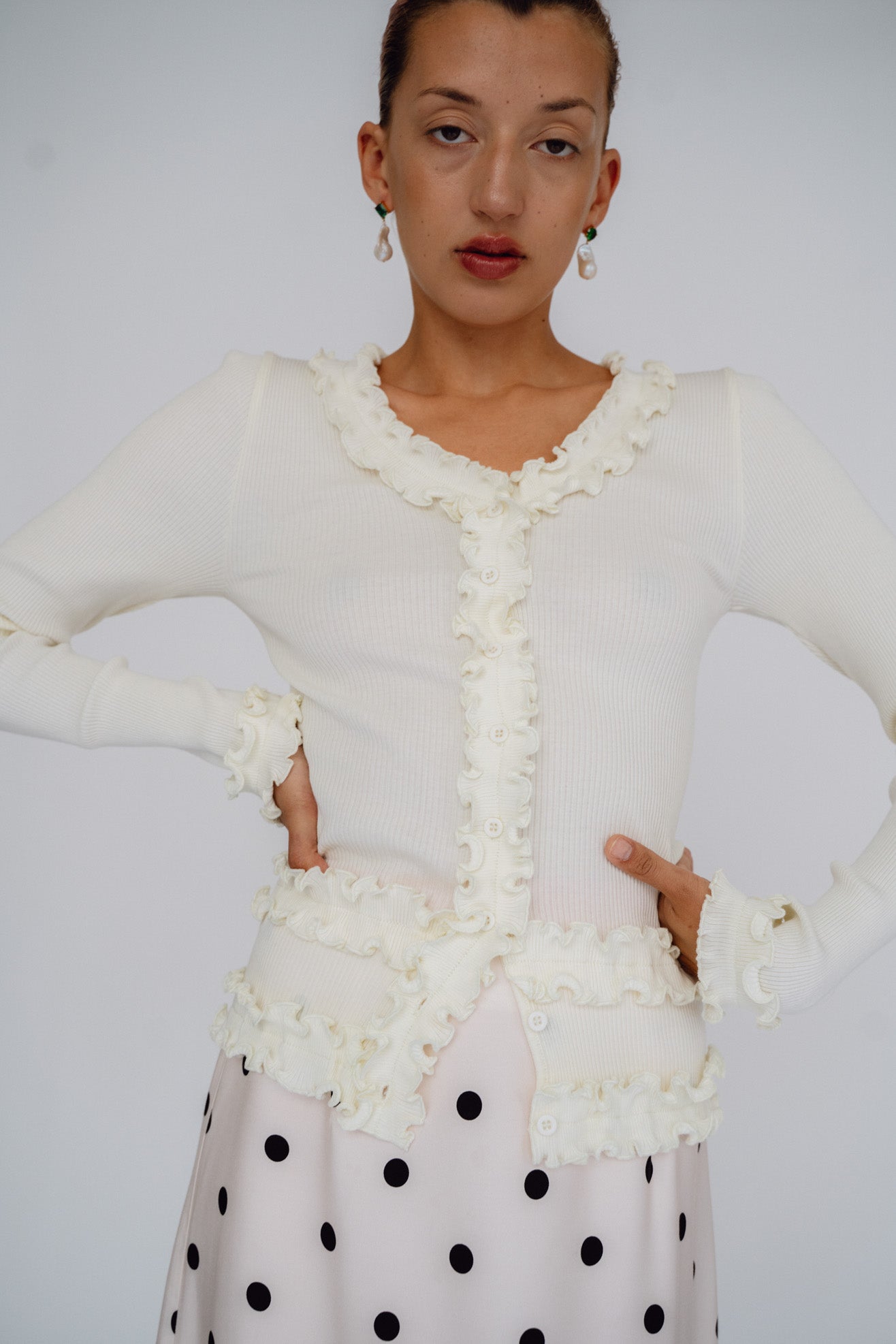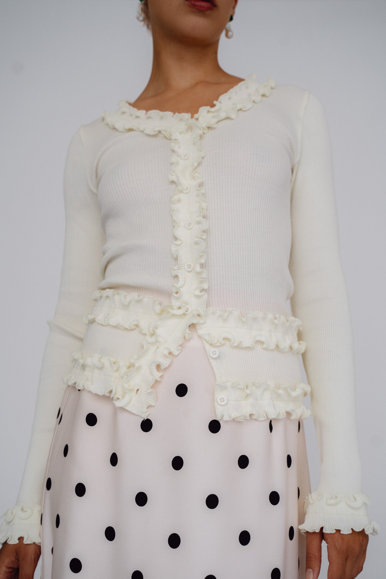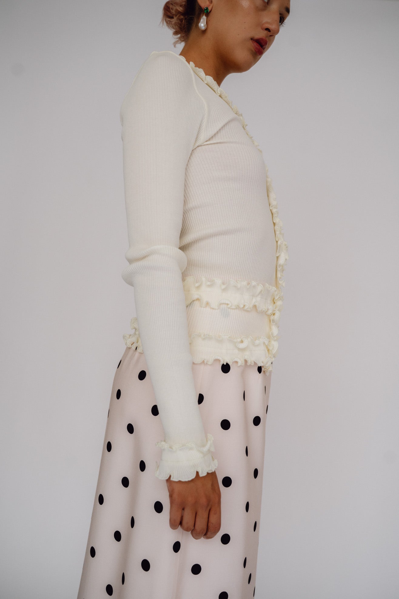 Long sleeve tee with Opera Sport signature ruffle detailing at neck, placket & hems in off white organic cotton ribbed jersey. V neck with button front placket.