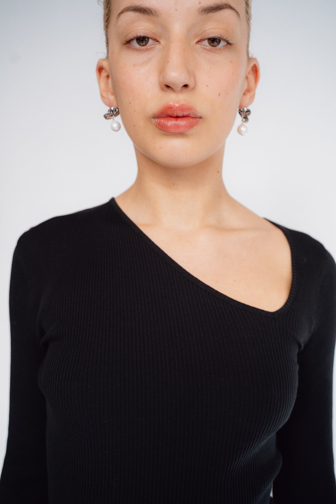 Signature top from OpéraSPORT with asymmetric neckline in 100% organic cotton. Close fit. Asymmetric V-neckline. Straight hem. Ribbed detailing all-over.