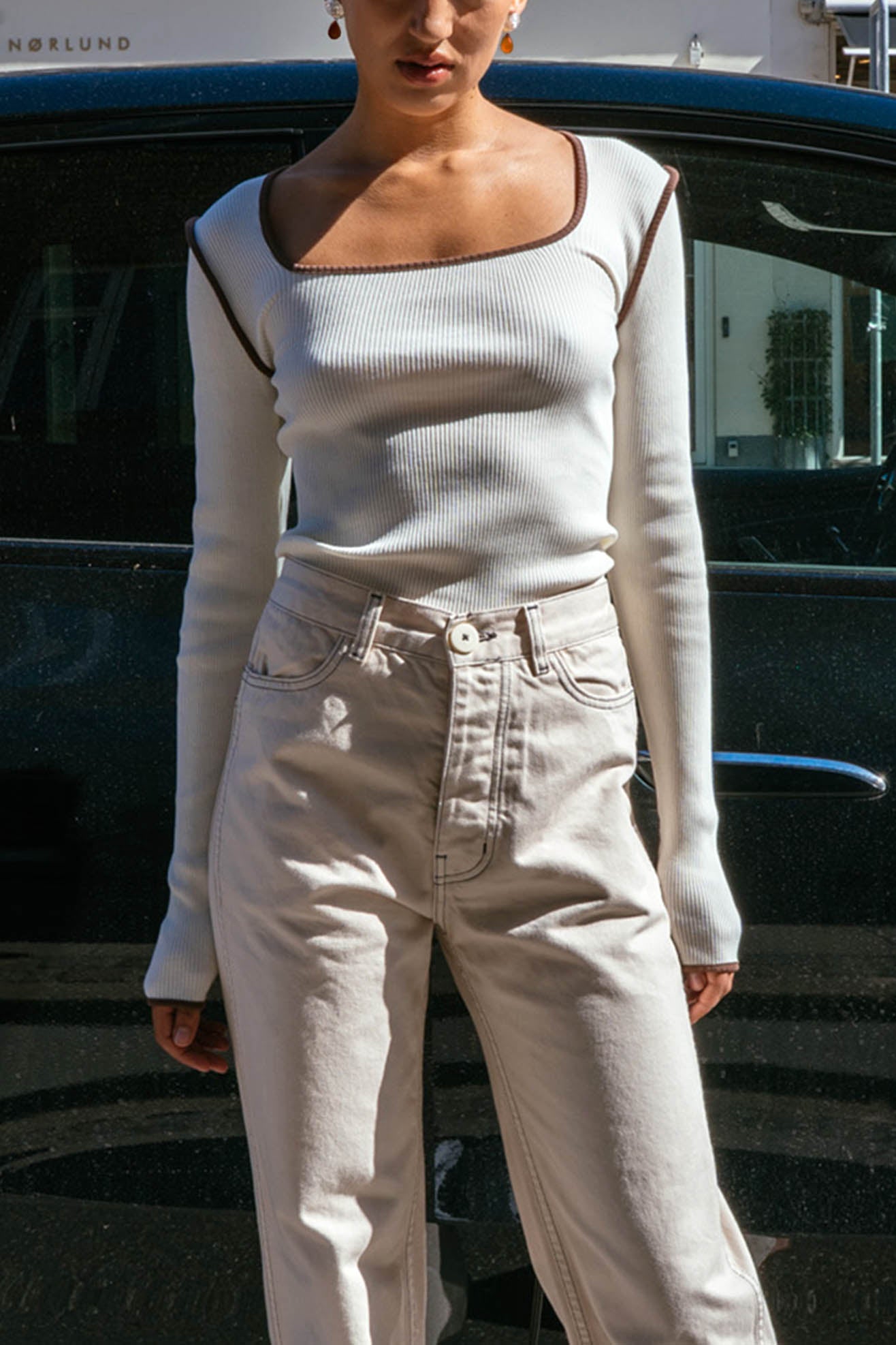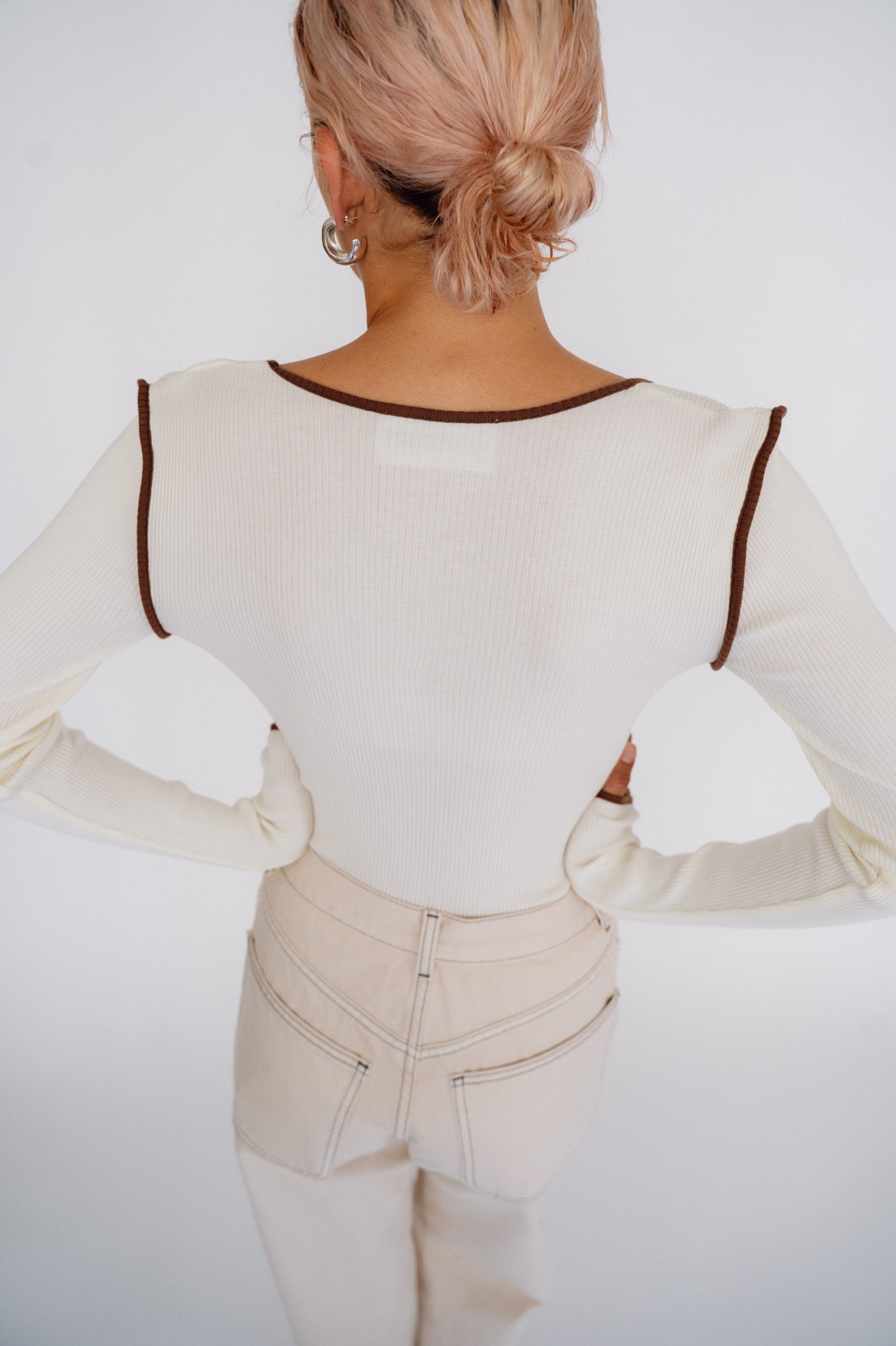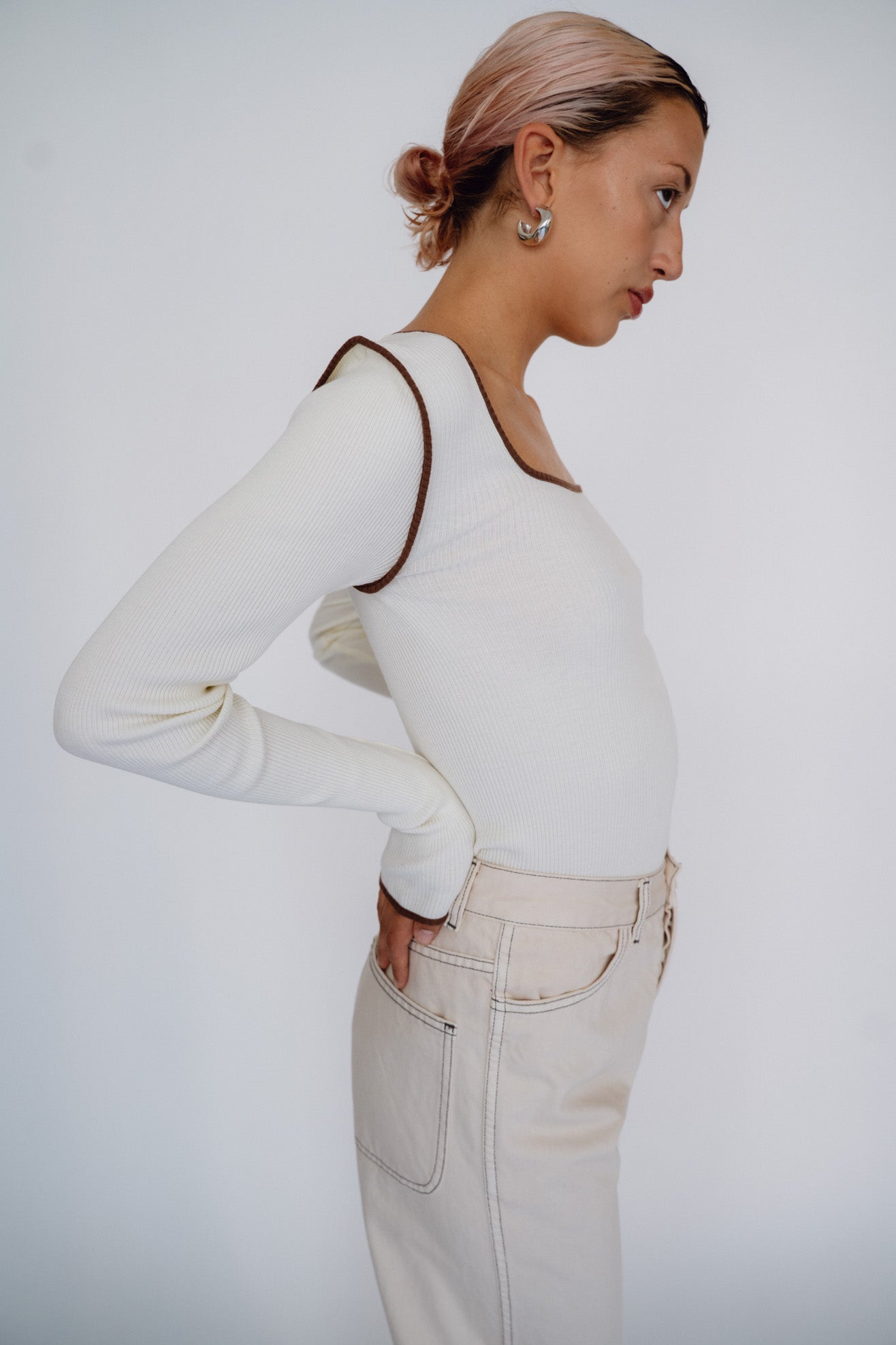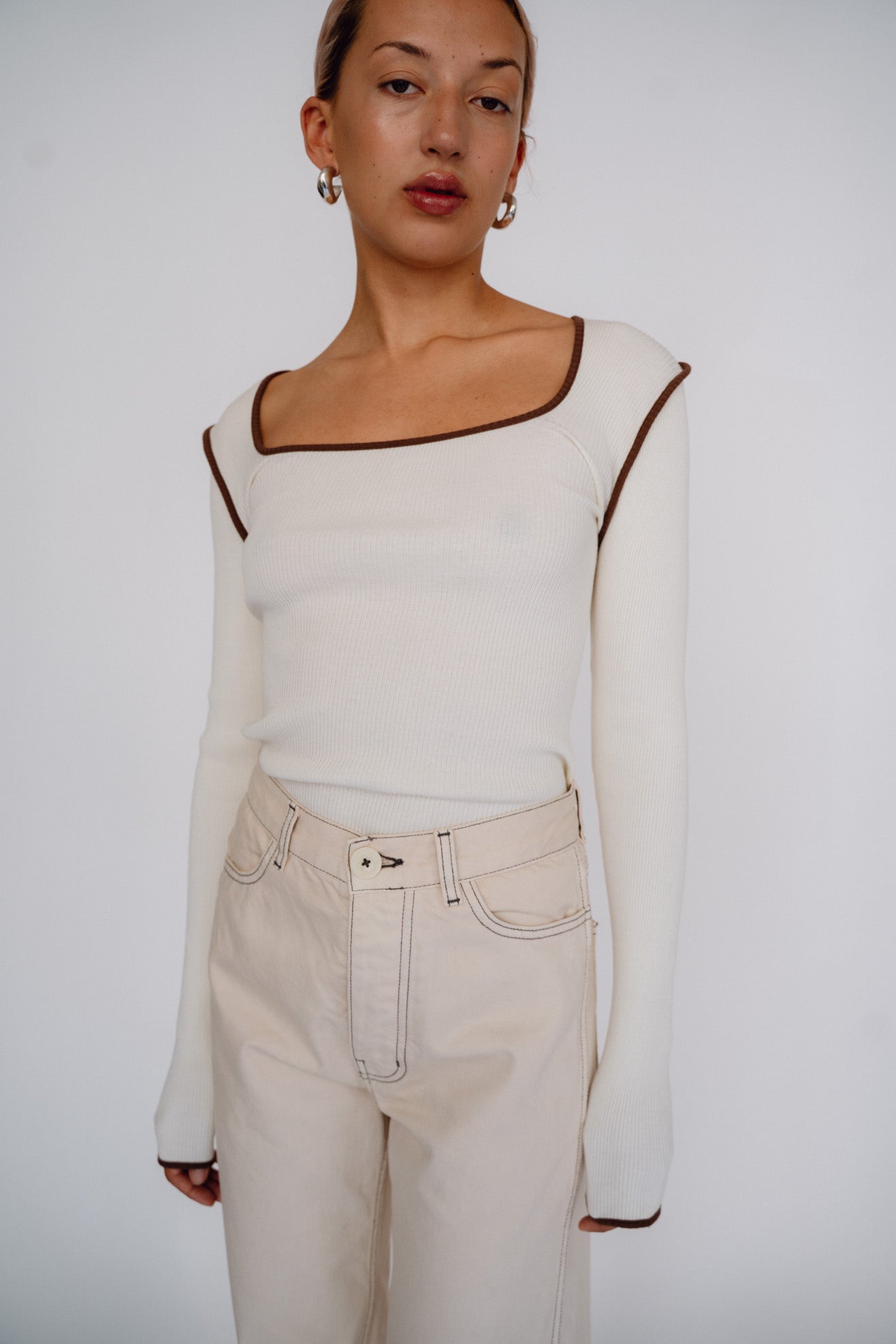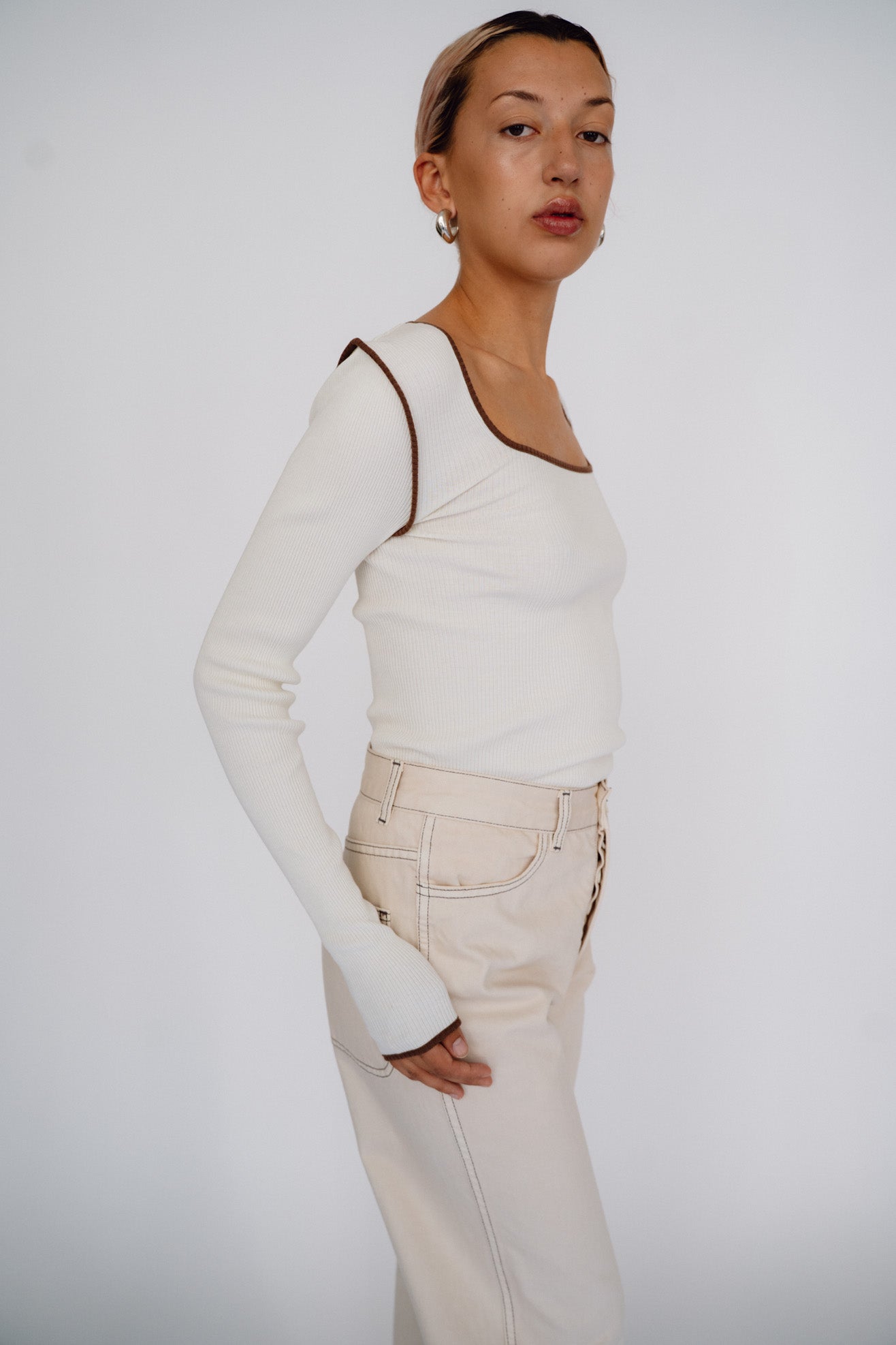 Long sleeve tee with square neck in off white organic cotton ribbed jersey with contrast brown binding at neck, armholes and sleeve opening. Slips on over head to be worn.