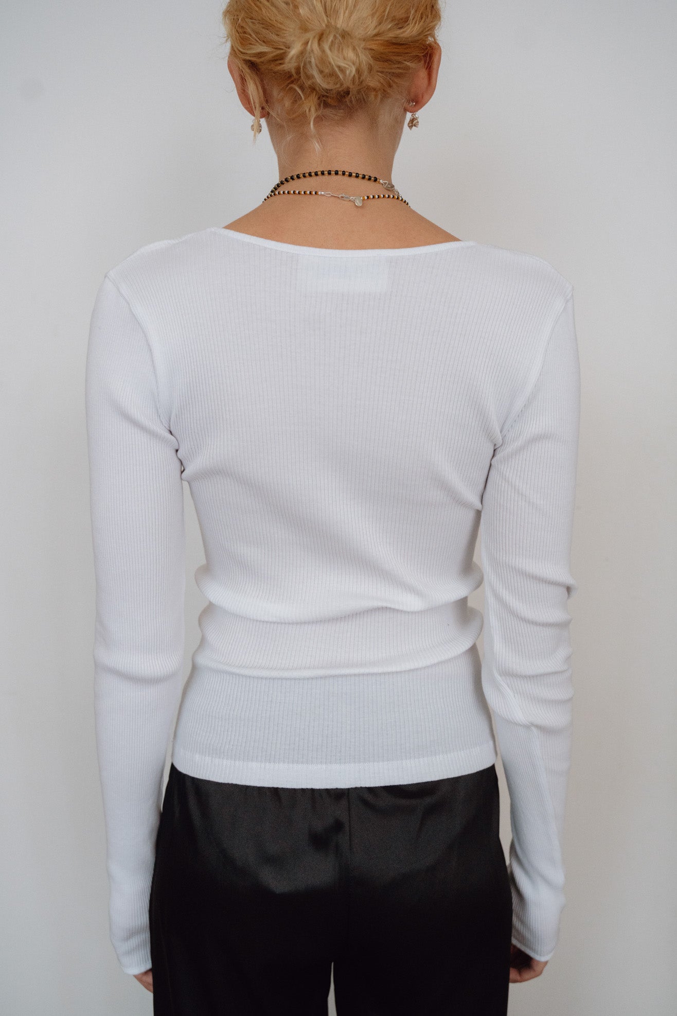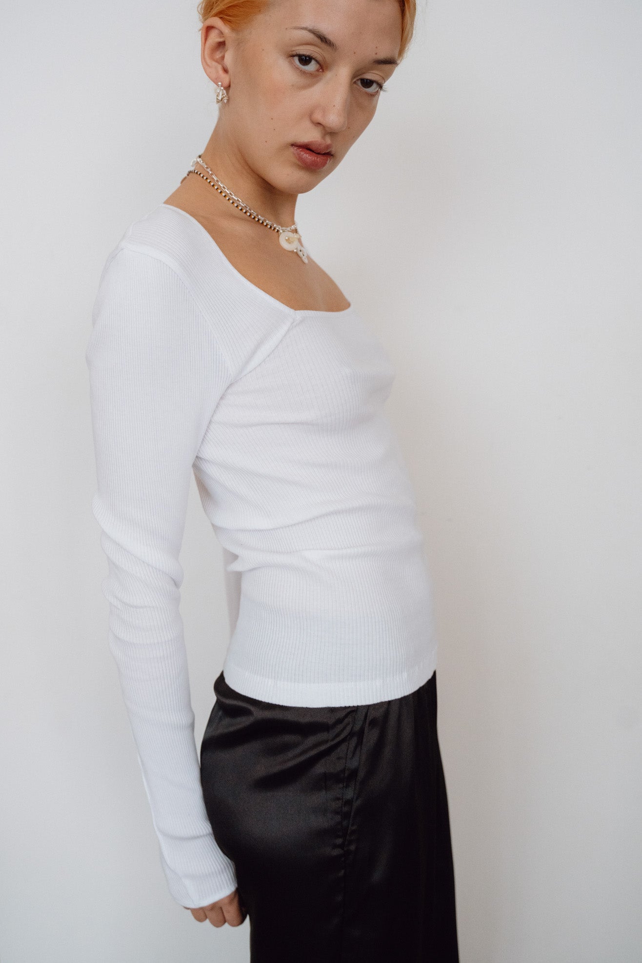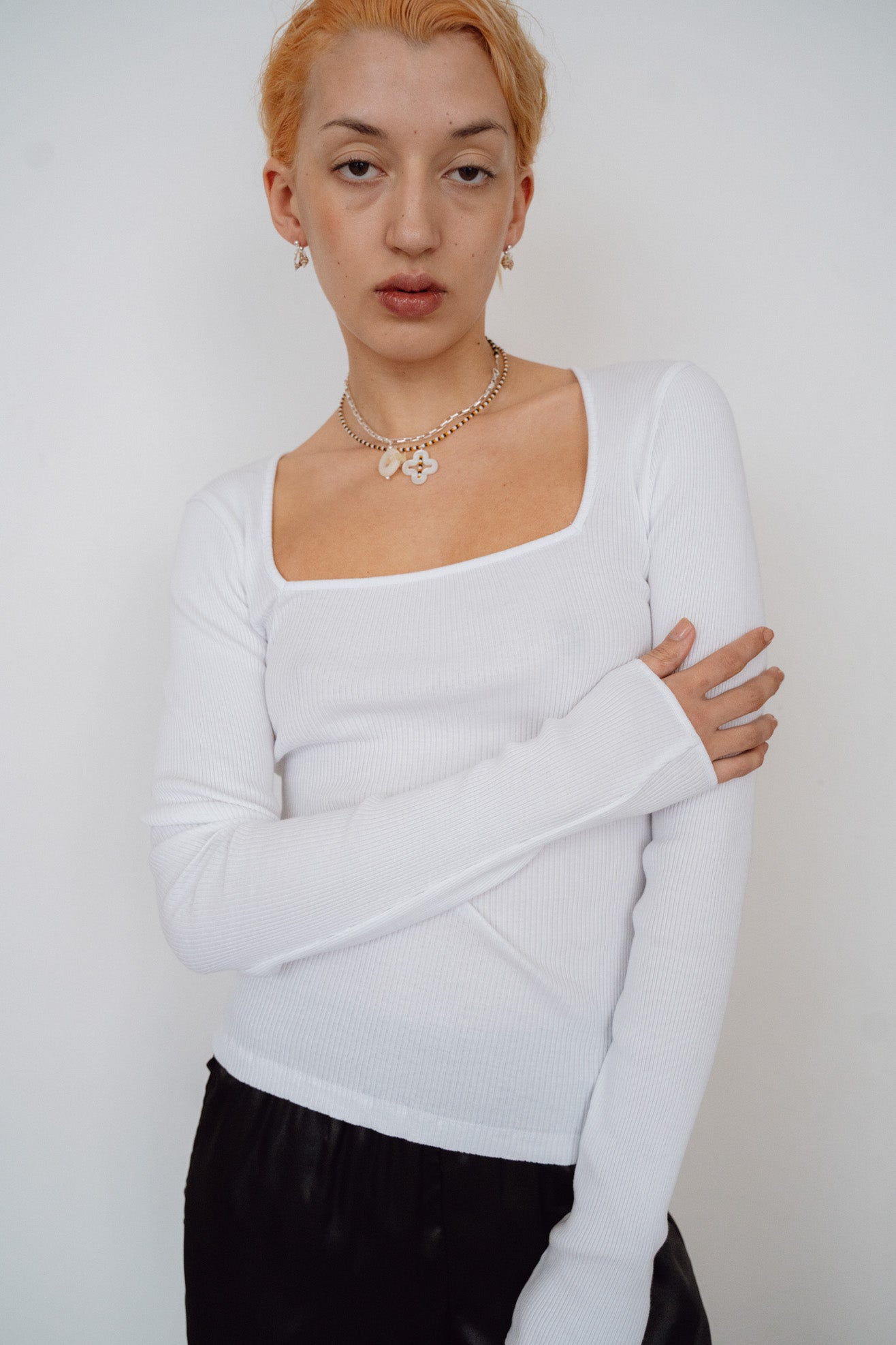 Ribbed long-sleeved top in 100% white organic cotton. Fitted silhouette, but very stretchable. Squared neckline.