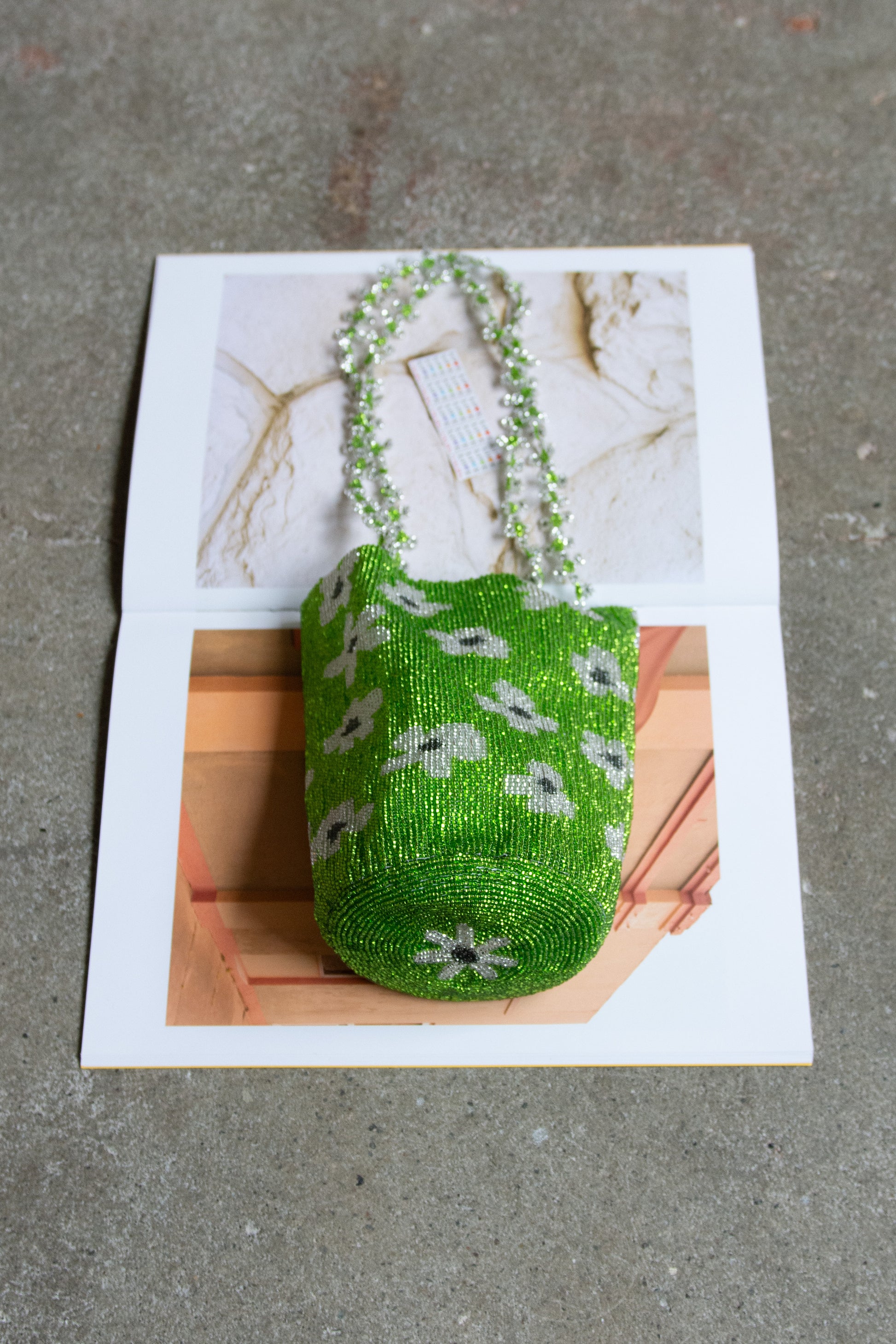 Hand woven pouch purse with flowers in glass beads. Green, black and silver beads. Tube handles that loop through the bag. Handwoven top and embroidered bottom making it hard and durable. Handmade with 35'750 glass beads, in 4 days, by 3 women in Guatemala.