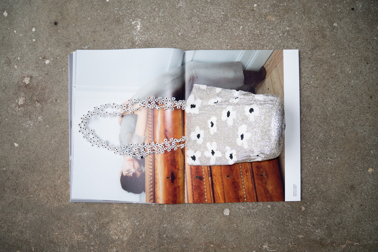 Hand woven pouch purse with flowers in glass beads. Silver, white and black beads. Tube handles that loop through the bag. Handwoven top and embroidered bottom making it hard and durable. Handmade with 35'750 glass beads, in 3 days, by 3 women in Guatemala.