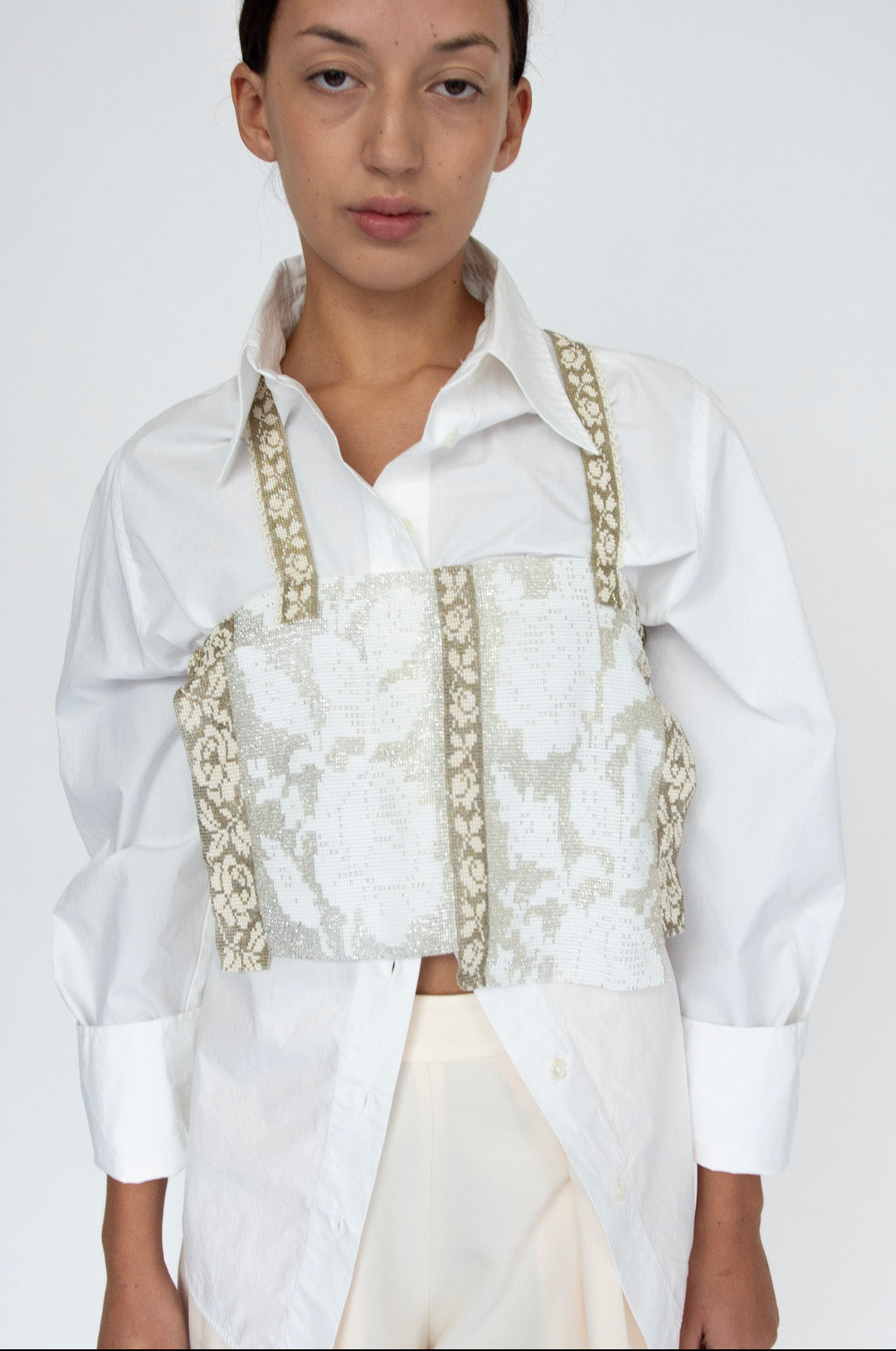 Hand woven top/bra with full lace pattern glass beads. Silver, White and Beige beads. 100% handmade.