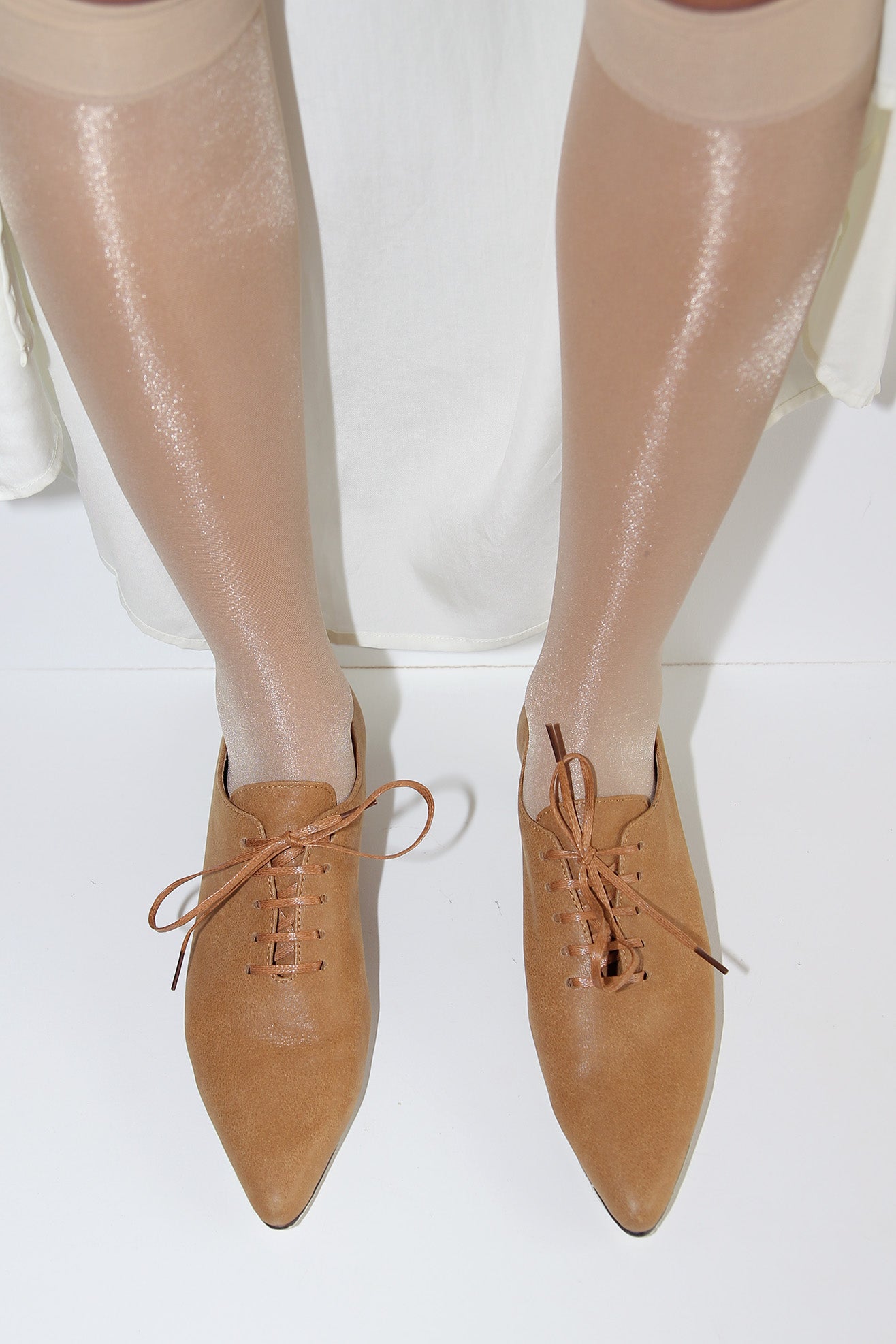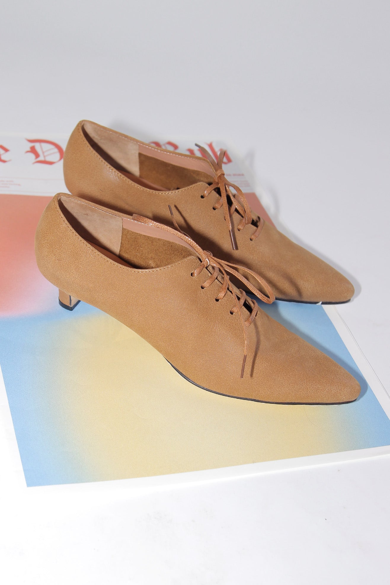 Pointed toe derby in brown leather with a low kitten heel. Contrast lacing at front in patterned patent leather. Fully lined.