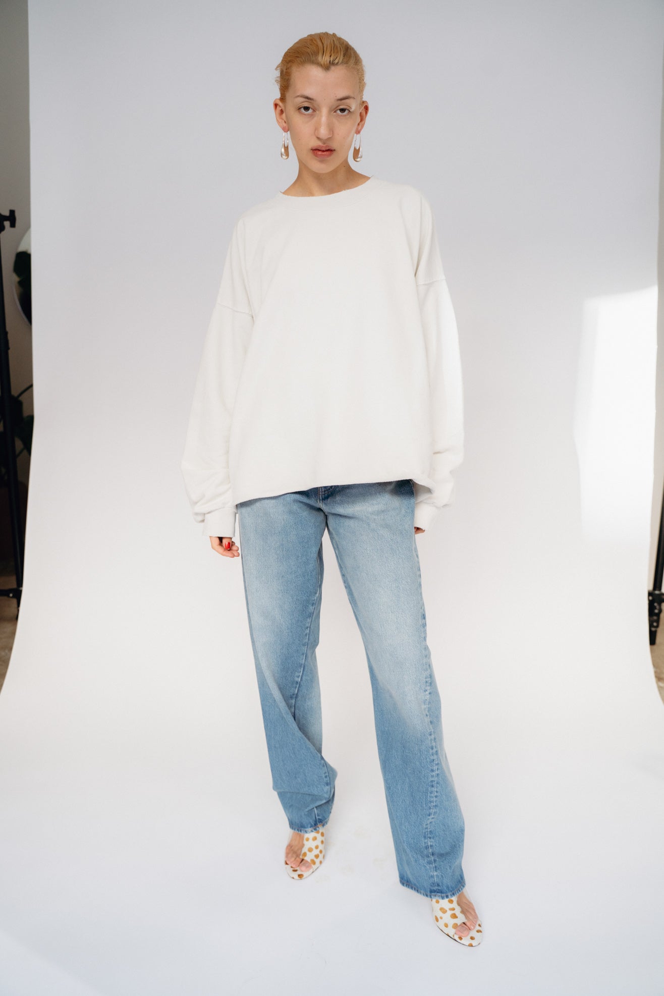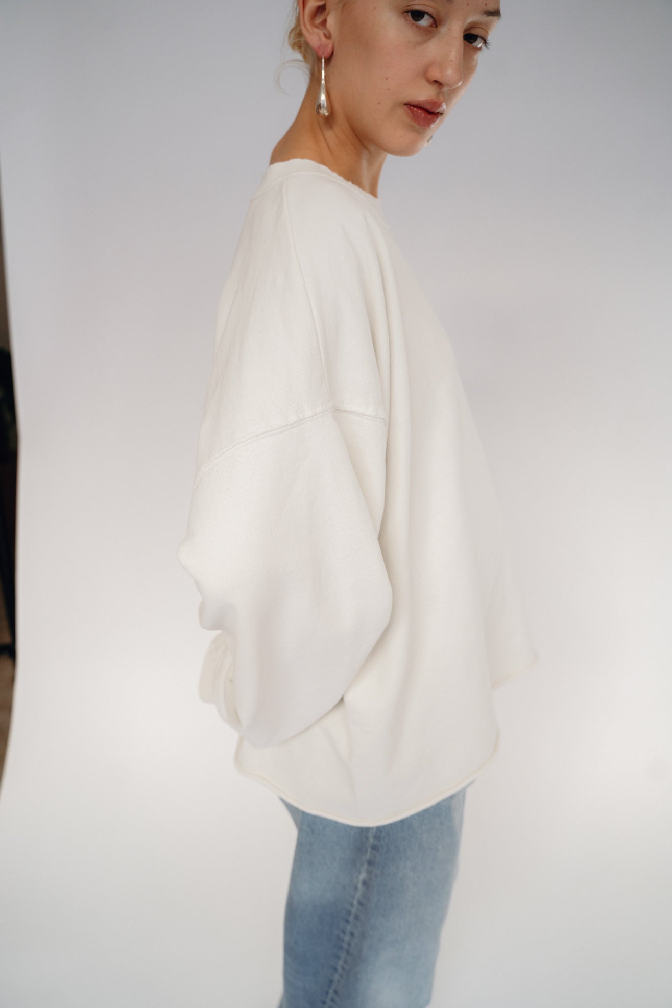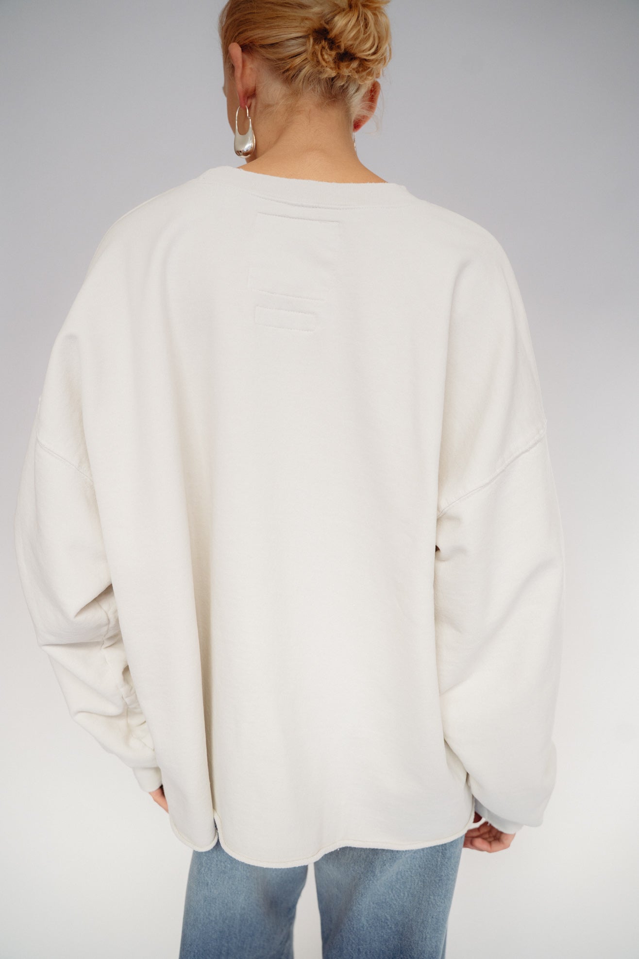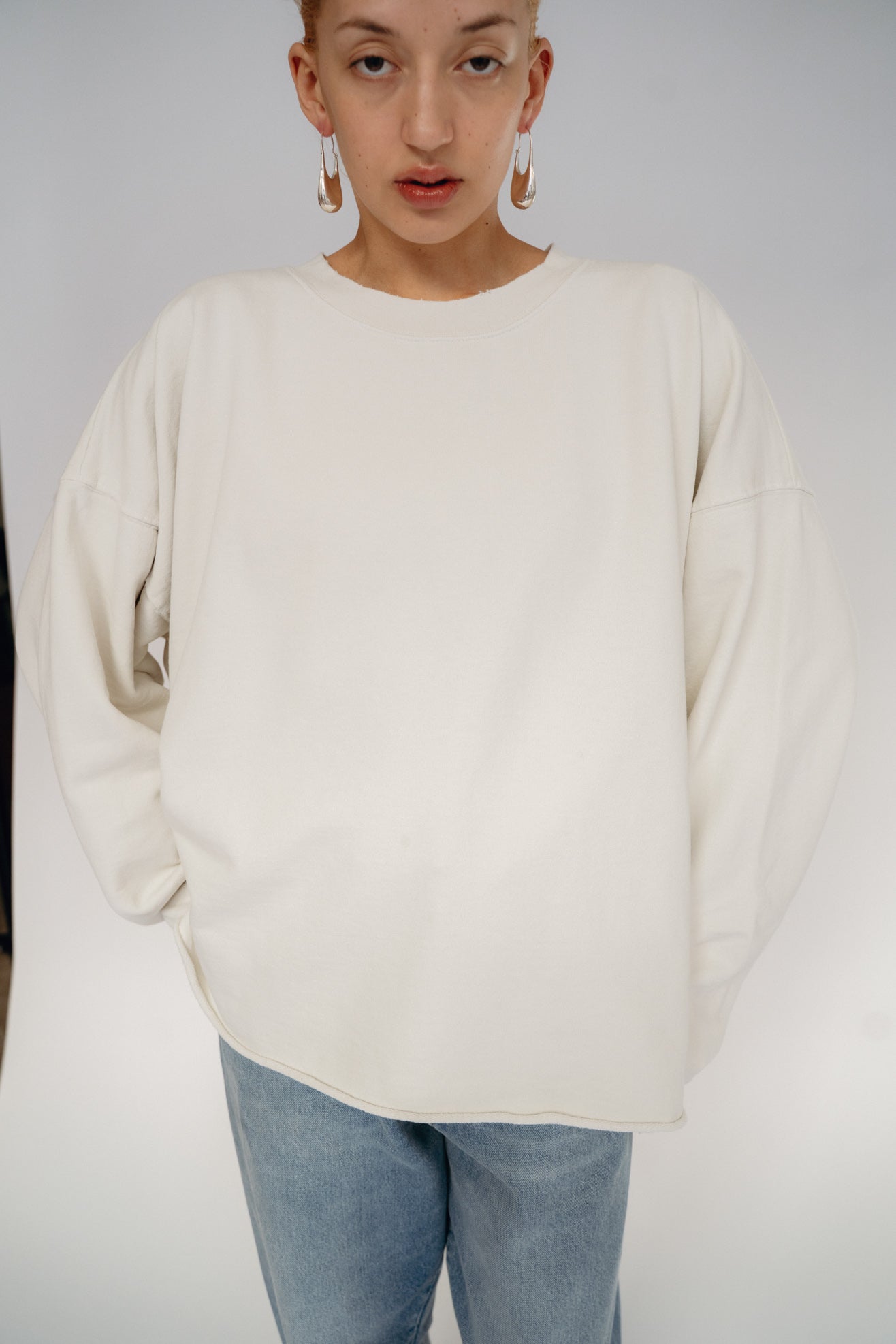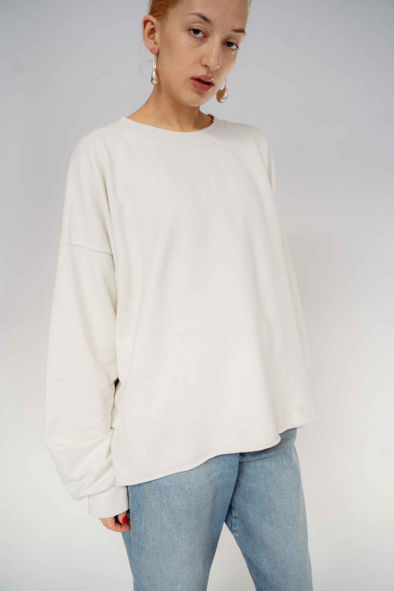 Oversized crew neck sweatshirt in off white cotton-blend French jersey. Drop shoulders. Raw hemline. Distressed details.