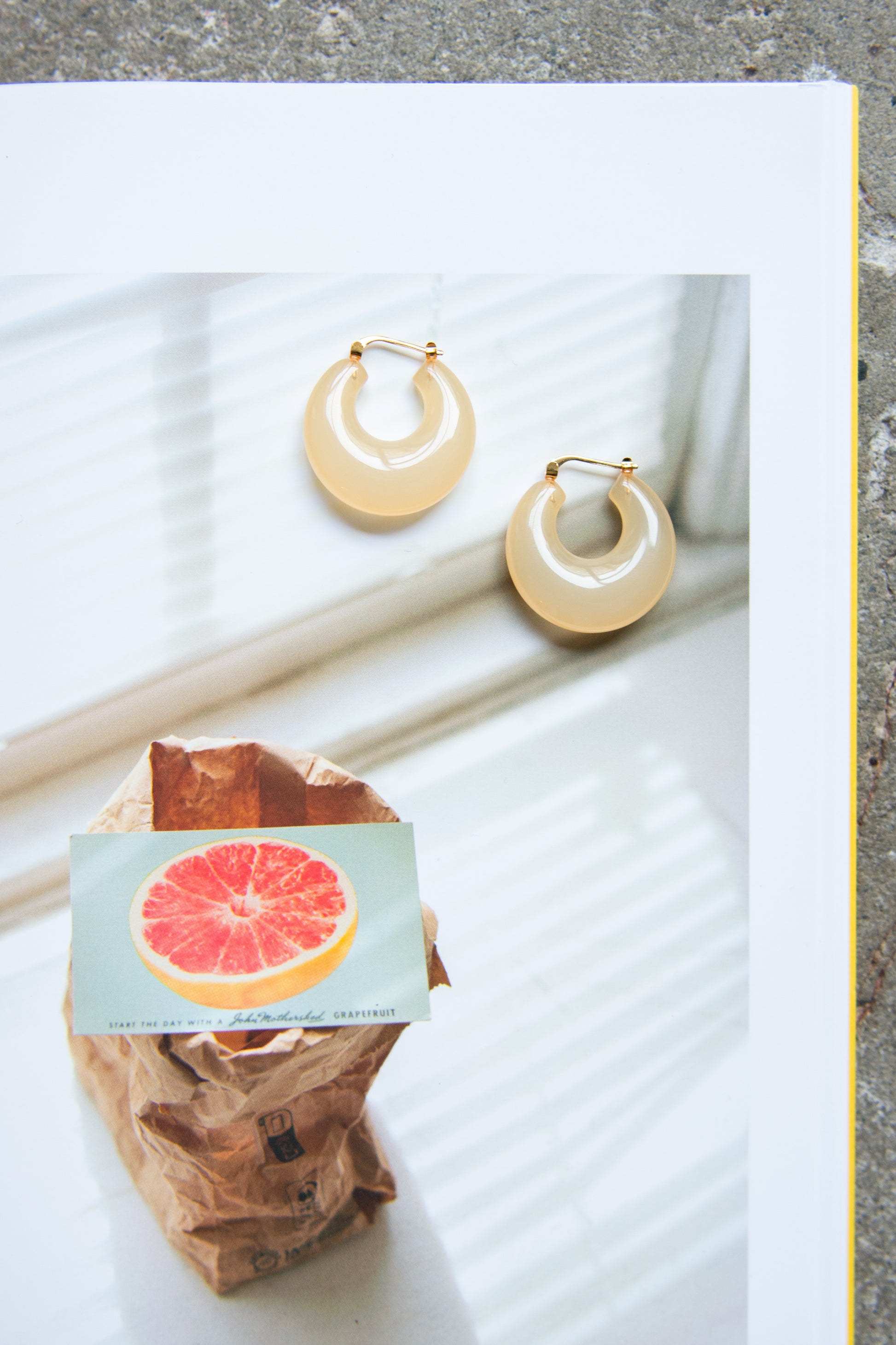 A chunky hoop earring with hinge closure made in dusty Yellow methacrylate. Made for pierced ears with surgical steel nickel free plated brass.
