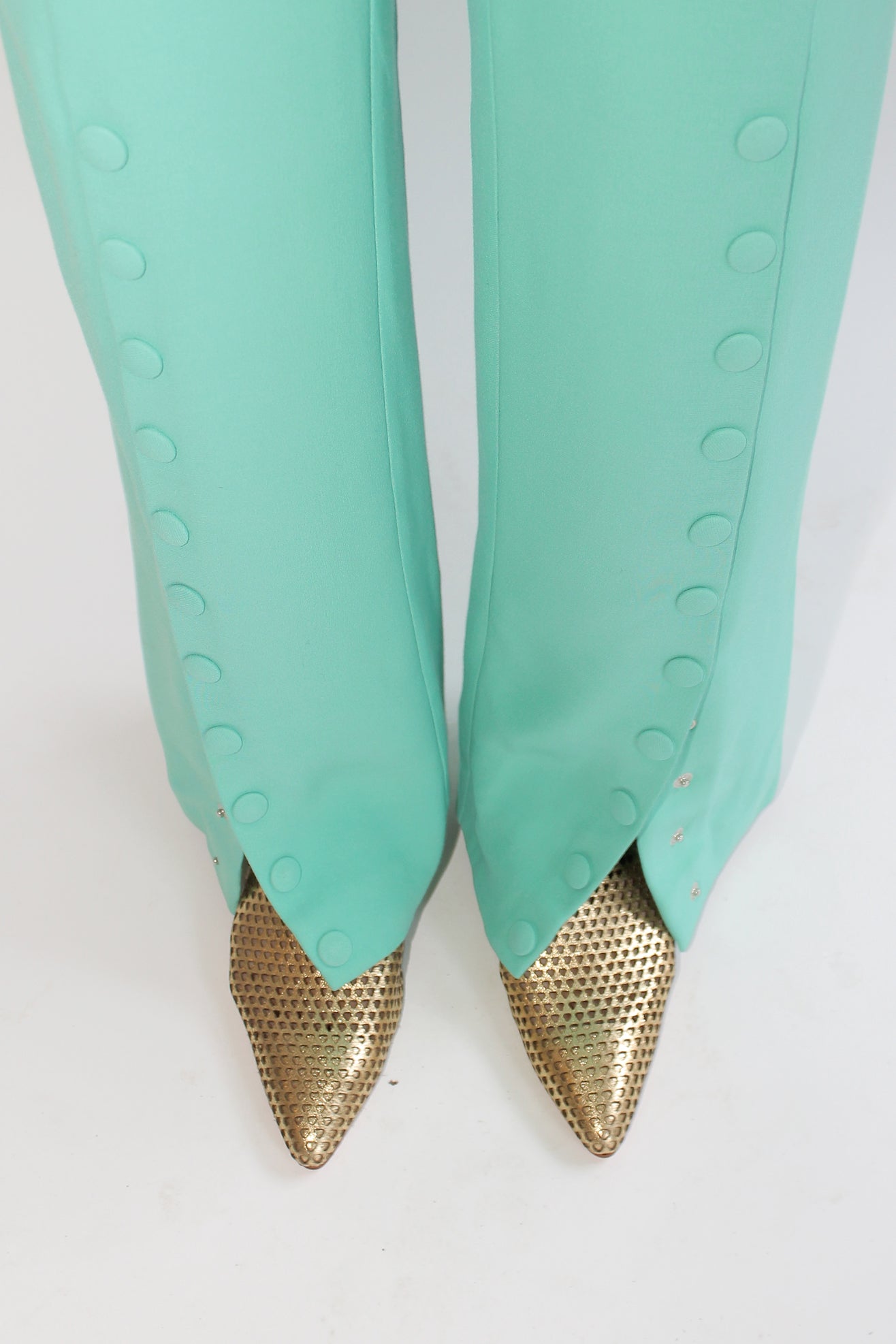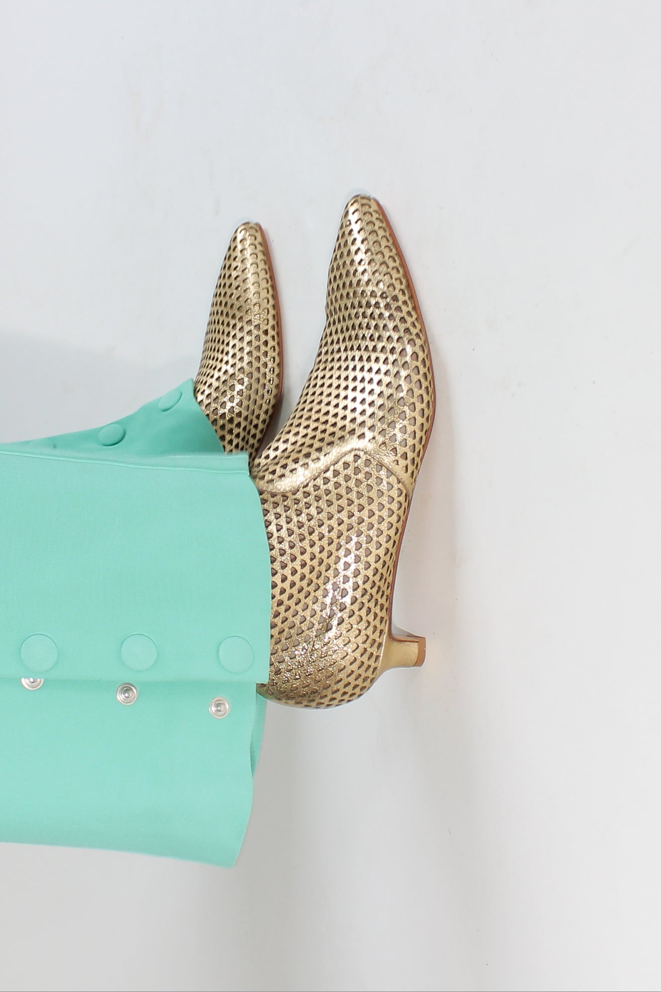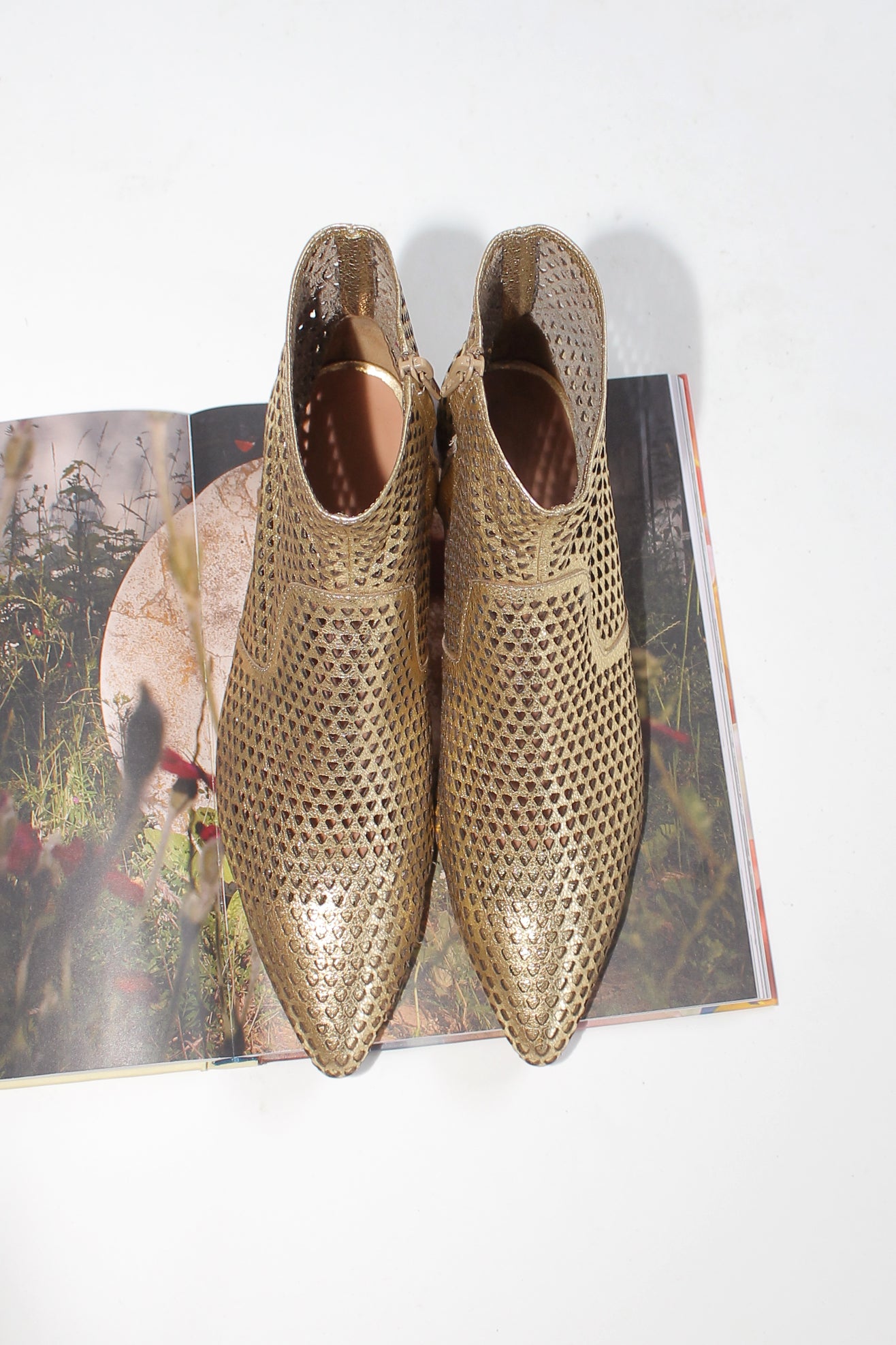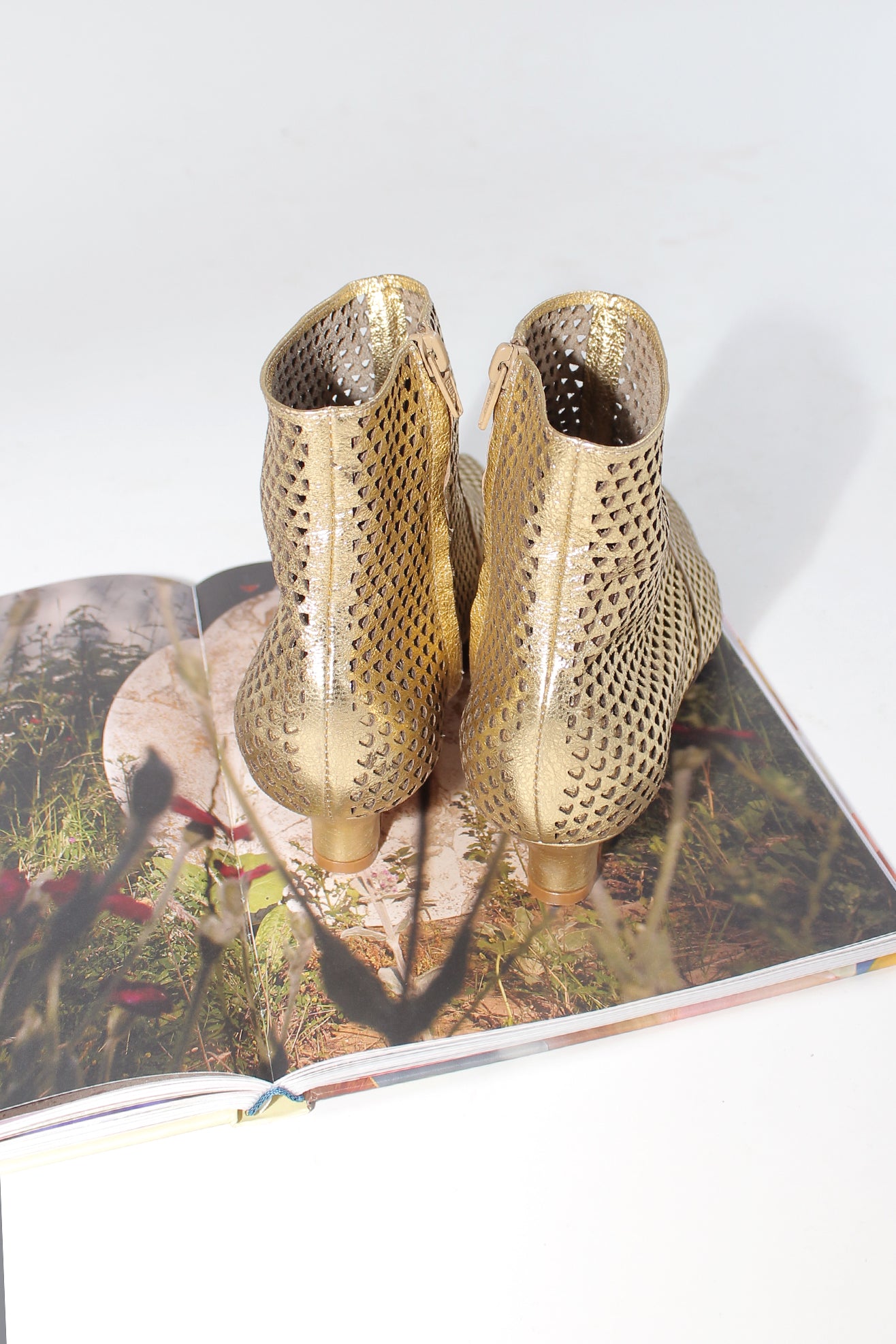 Pointy toe kitten heel ankle boots in metallic gold leather, with a perforated triangular design on soft leather that conforms elegantly to the foot. Zipper closure at inner ankle. Comfortable kitten heel.