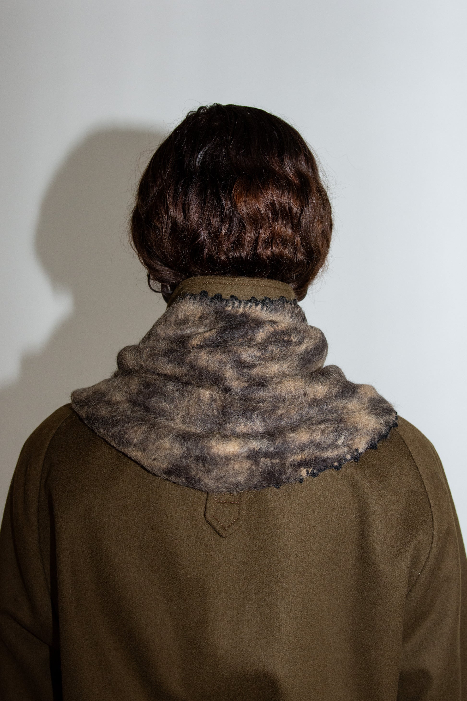 Knitted triangle scarf in animal-print-like melange alpaca blend yarn. Brushed for a fuzzy finish, with picot stitch trim. Triangle shape that can be worn at head or neck.