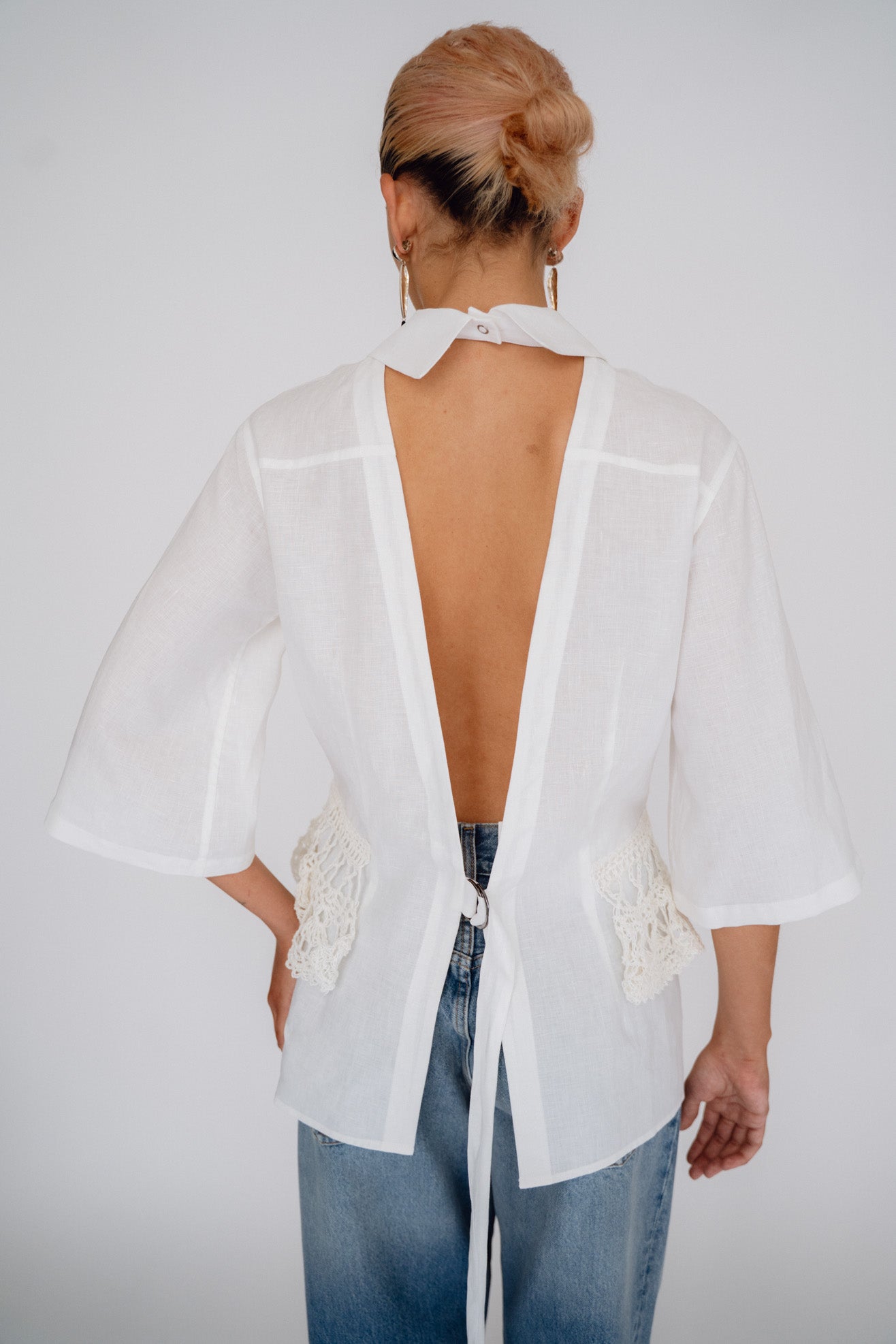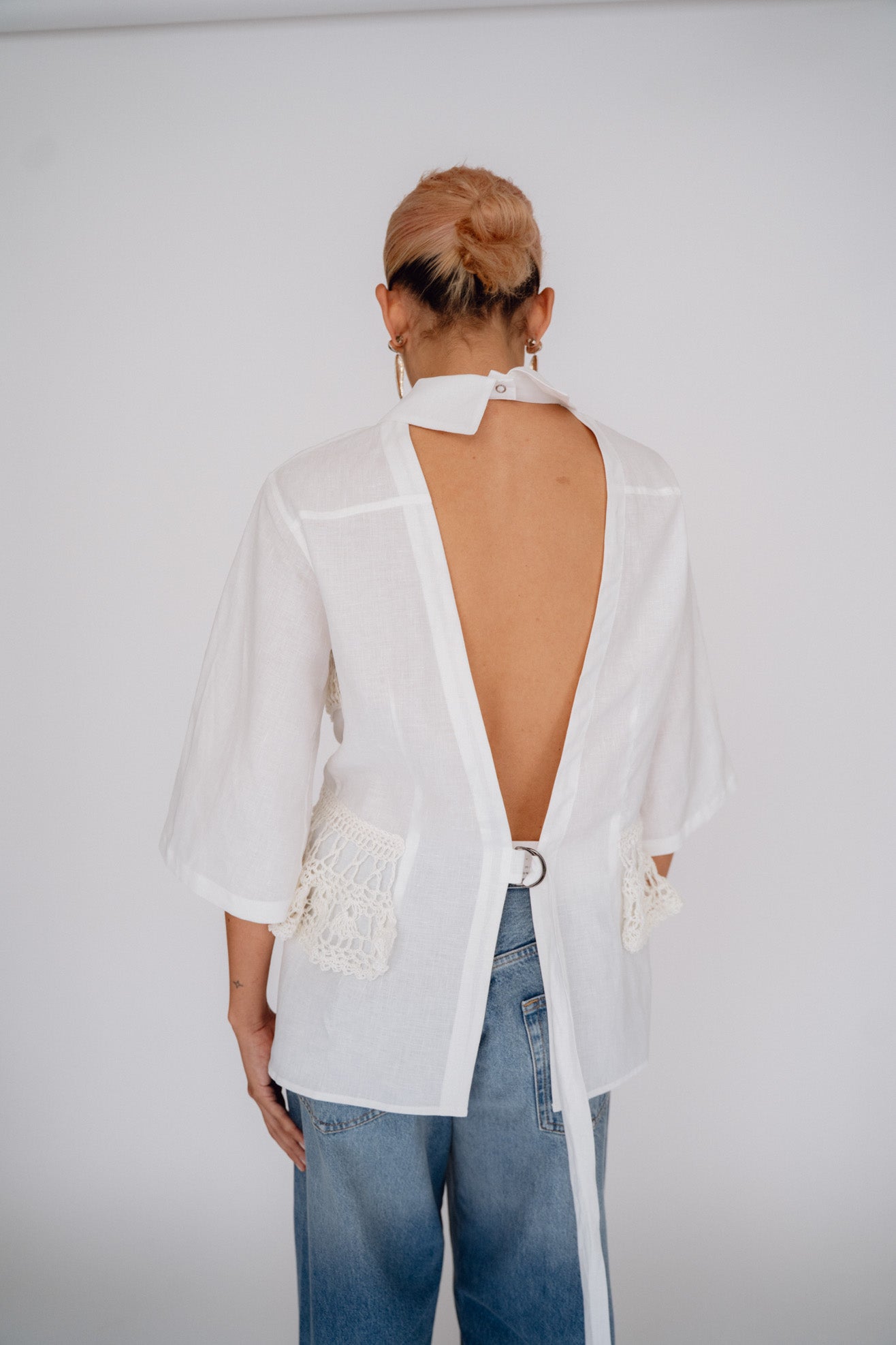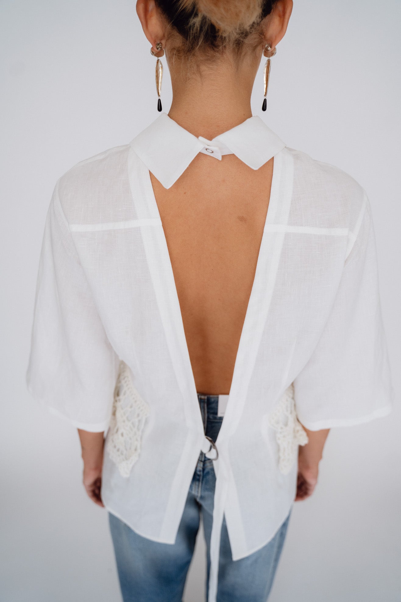 Open back short sleeve linen shirt with crochet front panels. Hand crocheted details. Shirt collar. Relaxed fit. Fake closure. Adjustable back strap.