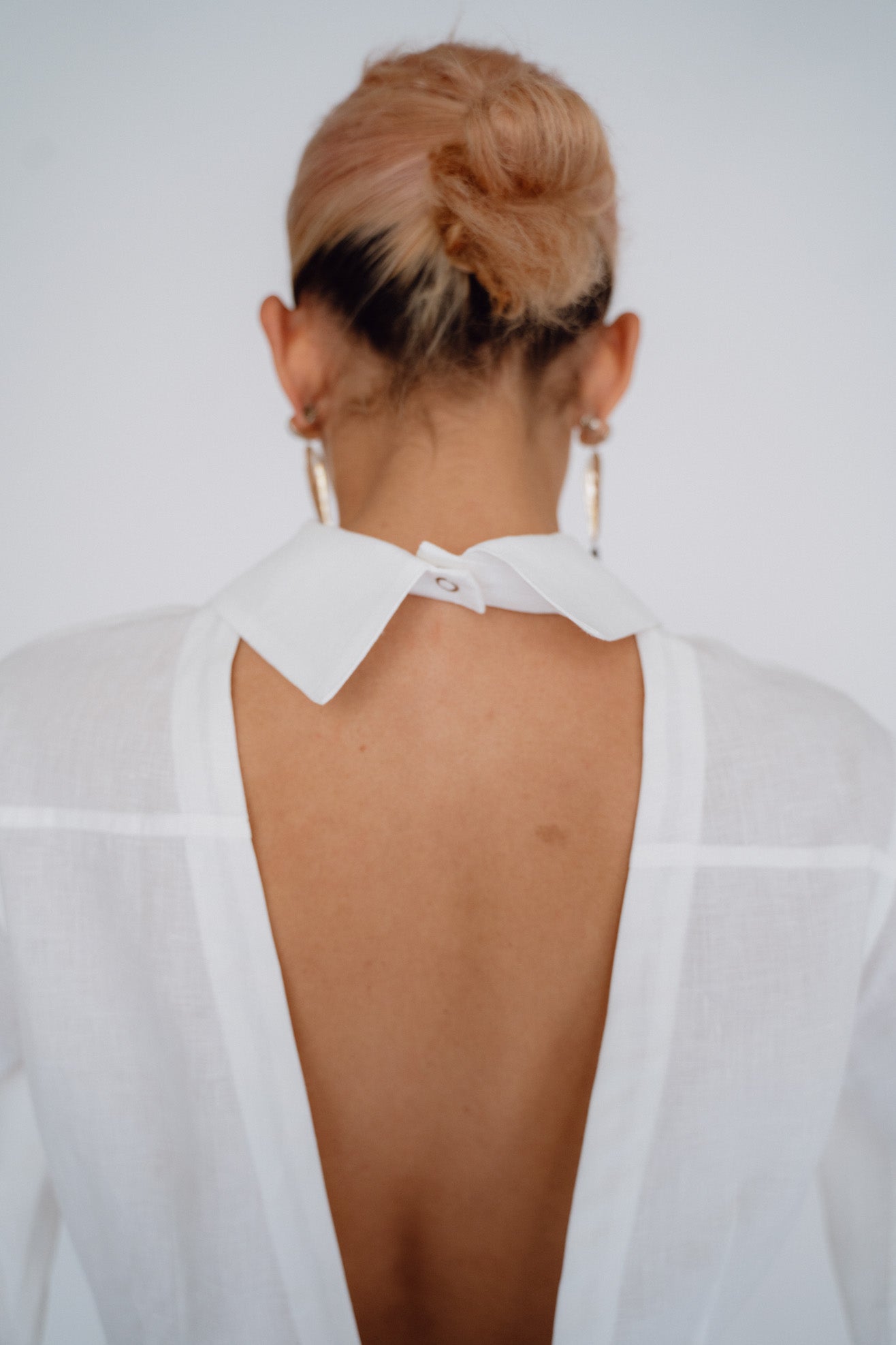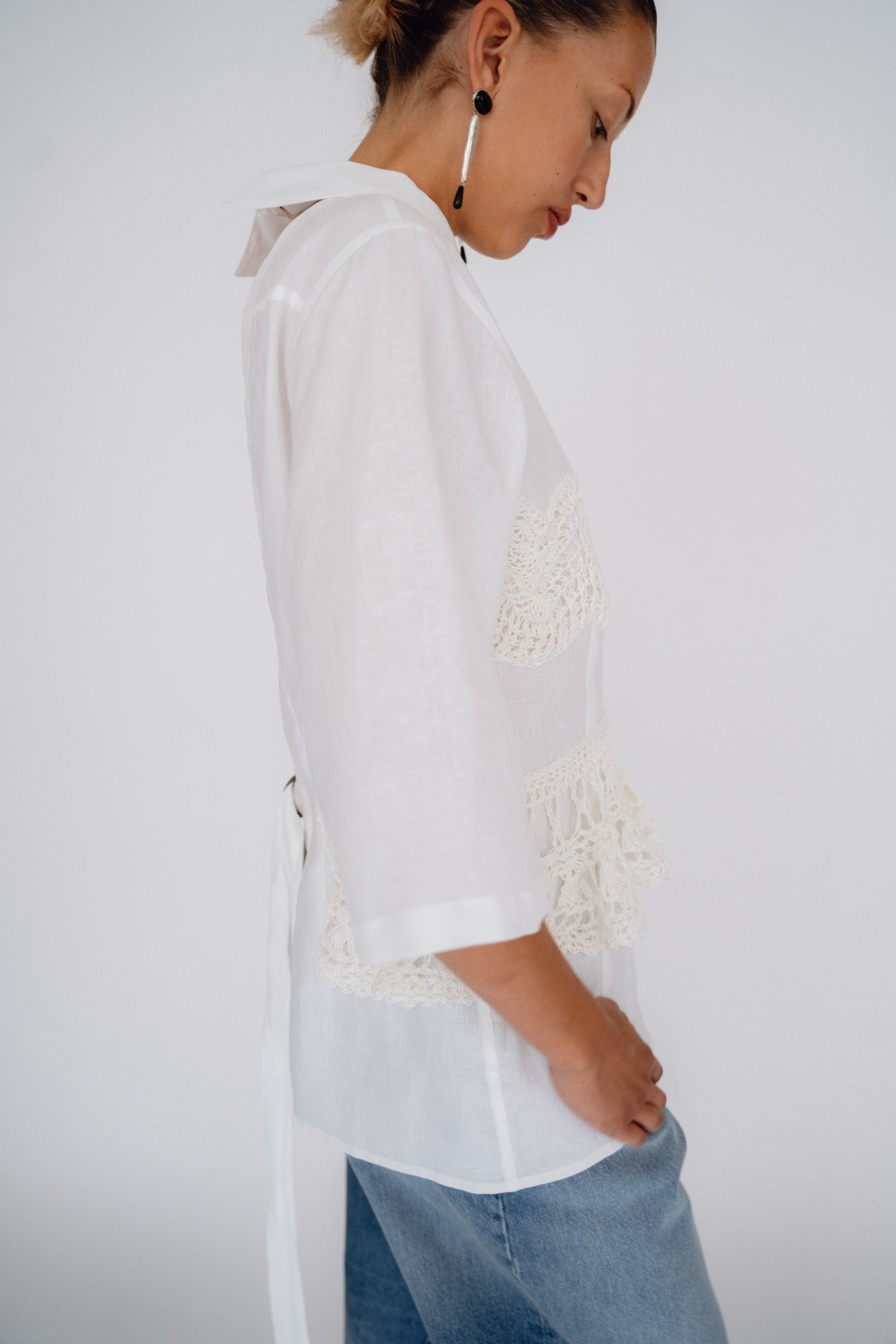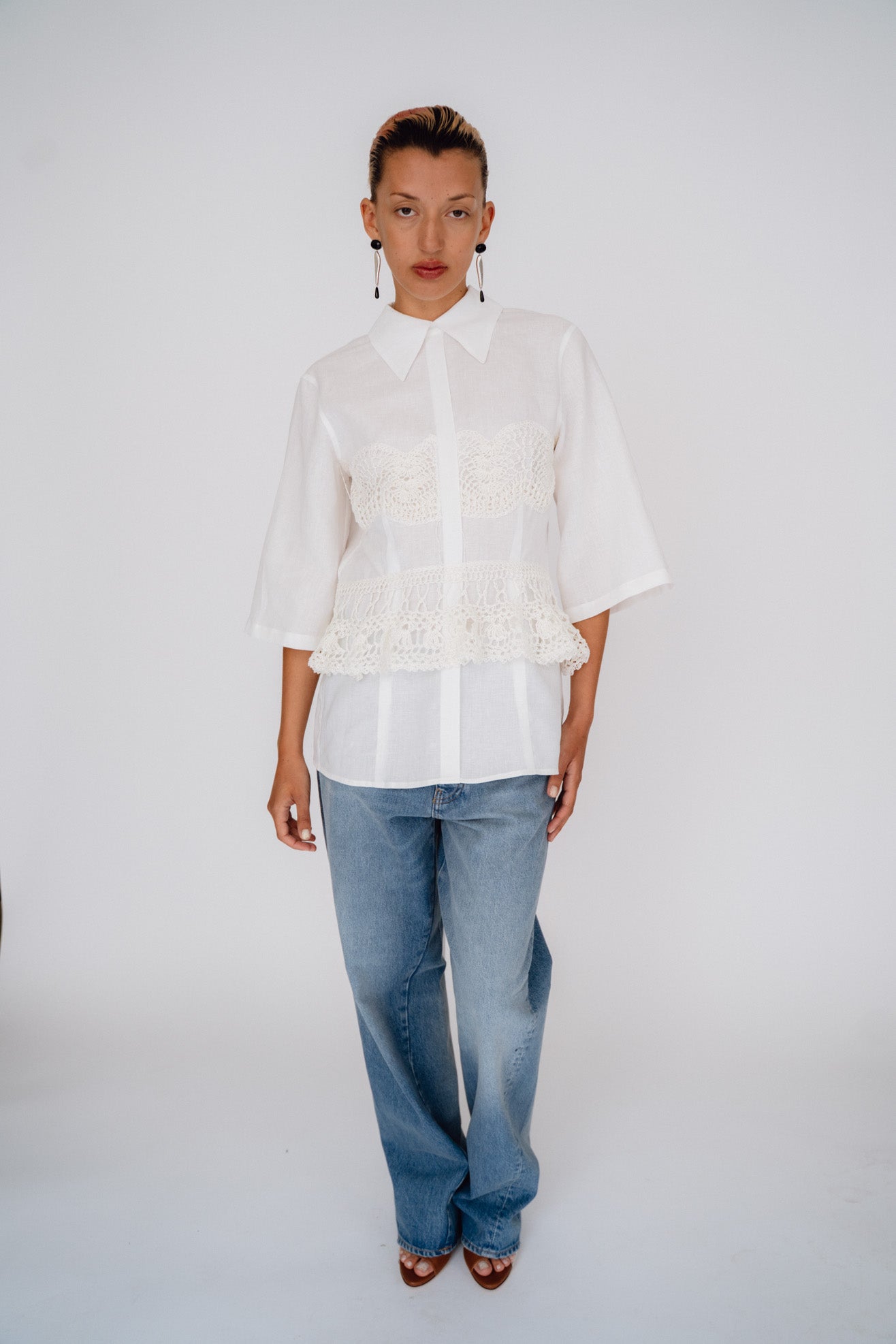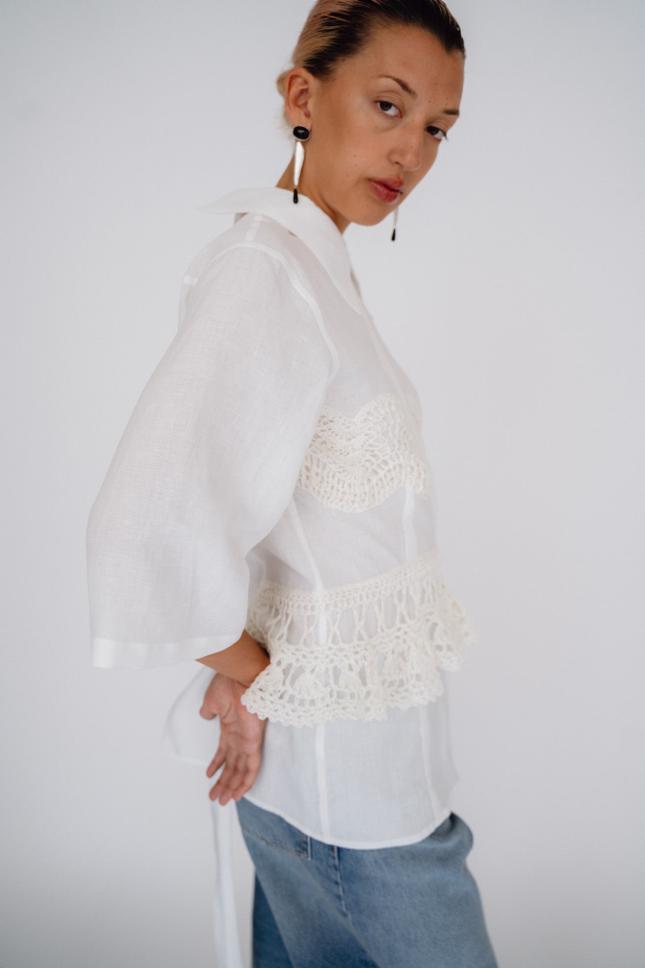 Open back short sleeve linen shirt with crochet front panels. Hand crocheted details. Shirt collar. Relaxed fit. Fake closure. Adjustable back strap.