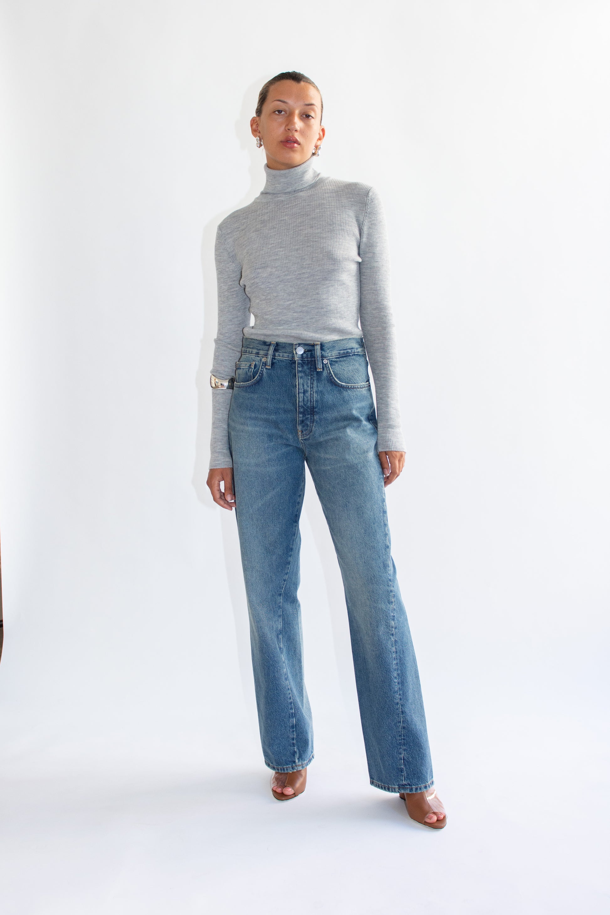 Mid-rise, Wide leg, 5-pocket jean in a 14 oz organic cotton indigo blue denim. Washed for a dark blue vintage feel. Twisted seam detail at leg to create slight barrel leg. Belt loops. Silver metal hardware.