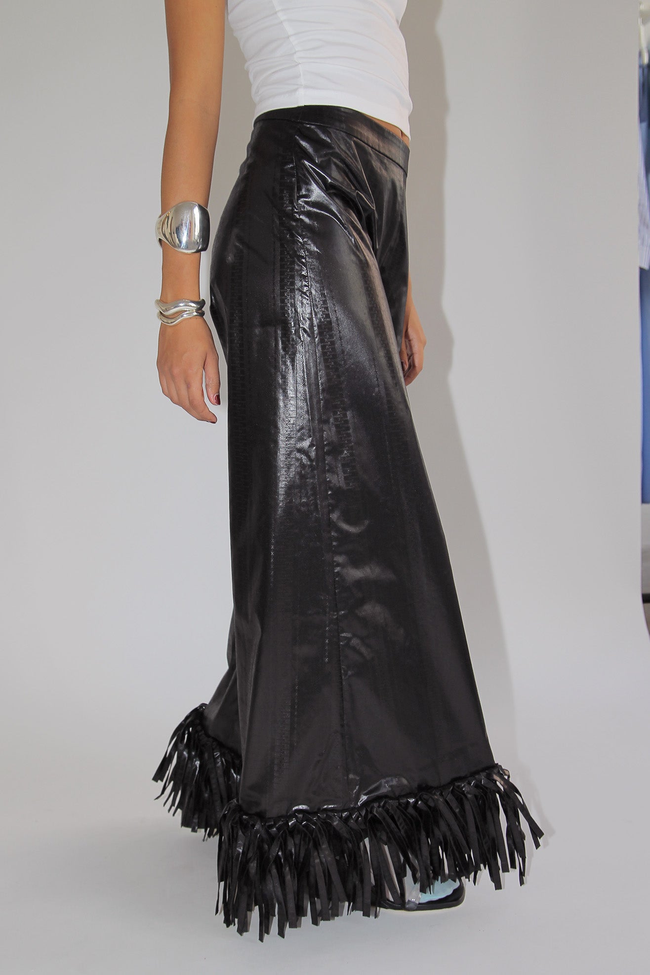 Wide-leg long flared trousers in bazin cotton fabric with fringes. Mid-rise fit. Hidden side zipper closure for a seamless look.