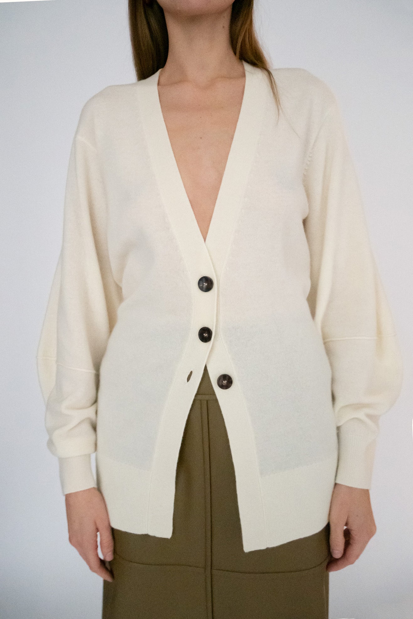 Cardigan with deep v-neck, in Ivory Wool/Cashmere blend. Three button closure. Long balloon sleeves.