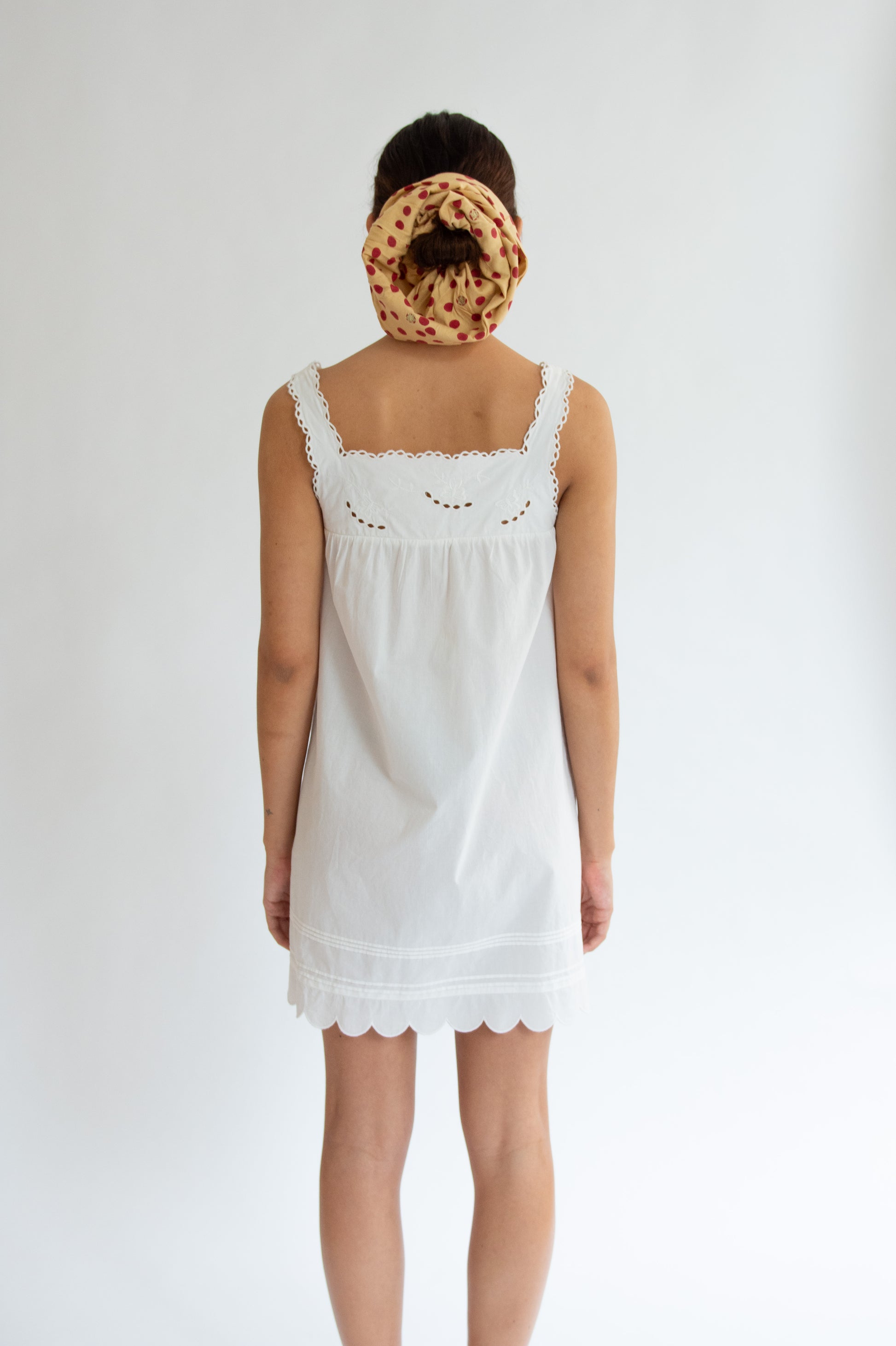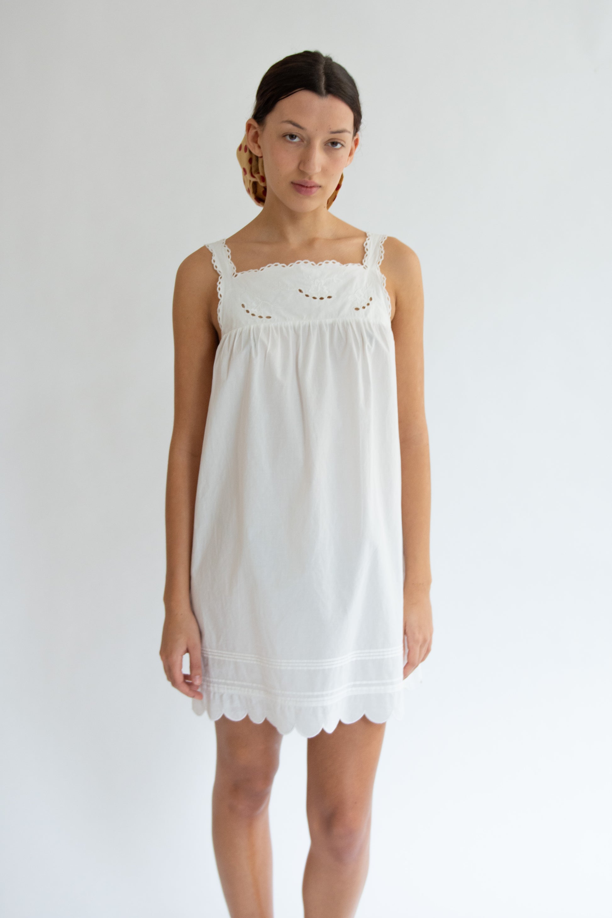 Short white dress in 100% organic cotton. Square neckline. Scalloped lace trim. Embroidered cutwork detailing at bodice. Wide hem panel with embroidered cutwork detailing. Relaxed silhouette. Slip-on style.
