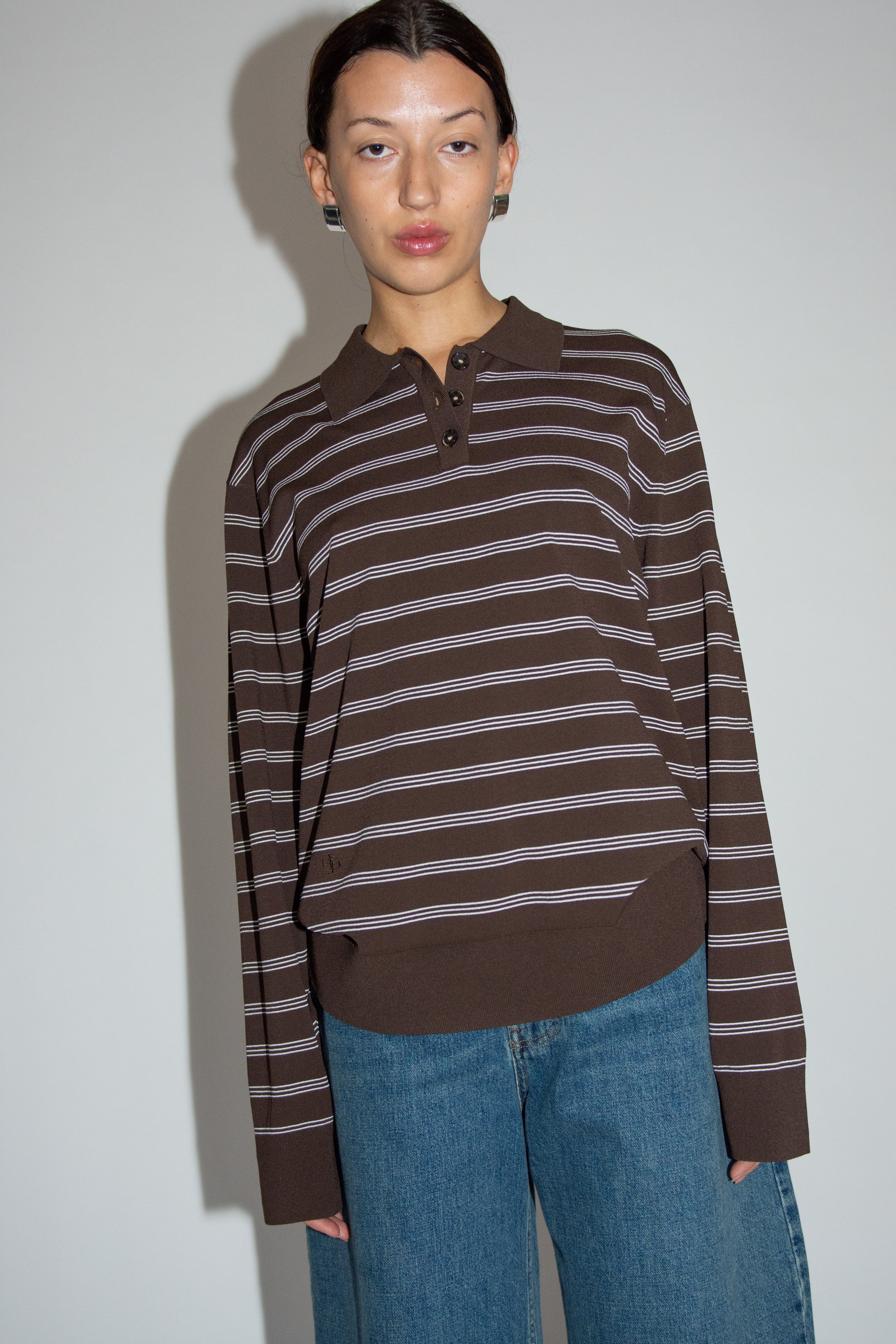 Long-sleeved striped collared polo shirt, made from soft 83% FSC viscose. Classic silhouette. Three-button placket neckline.