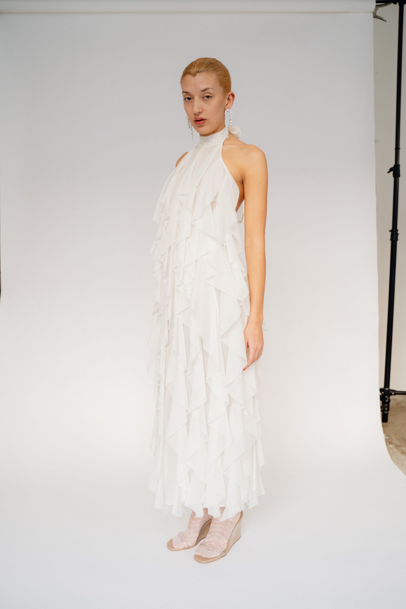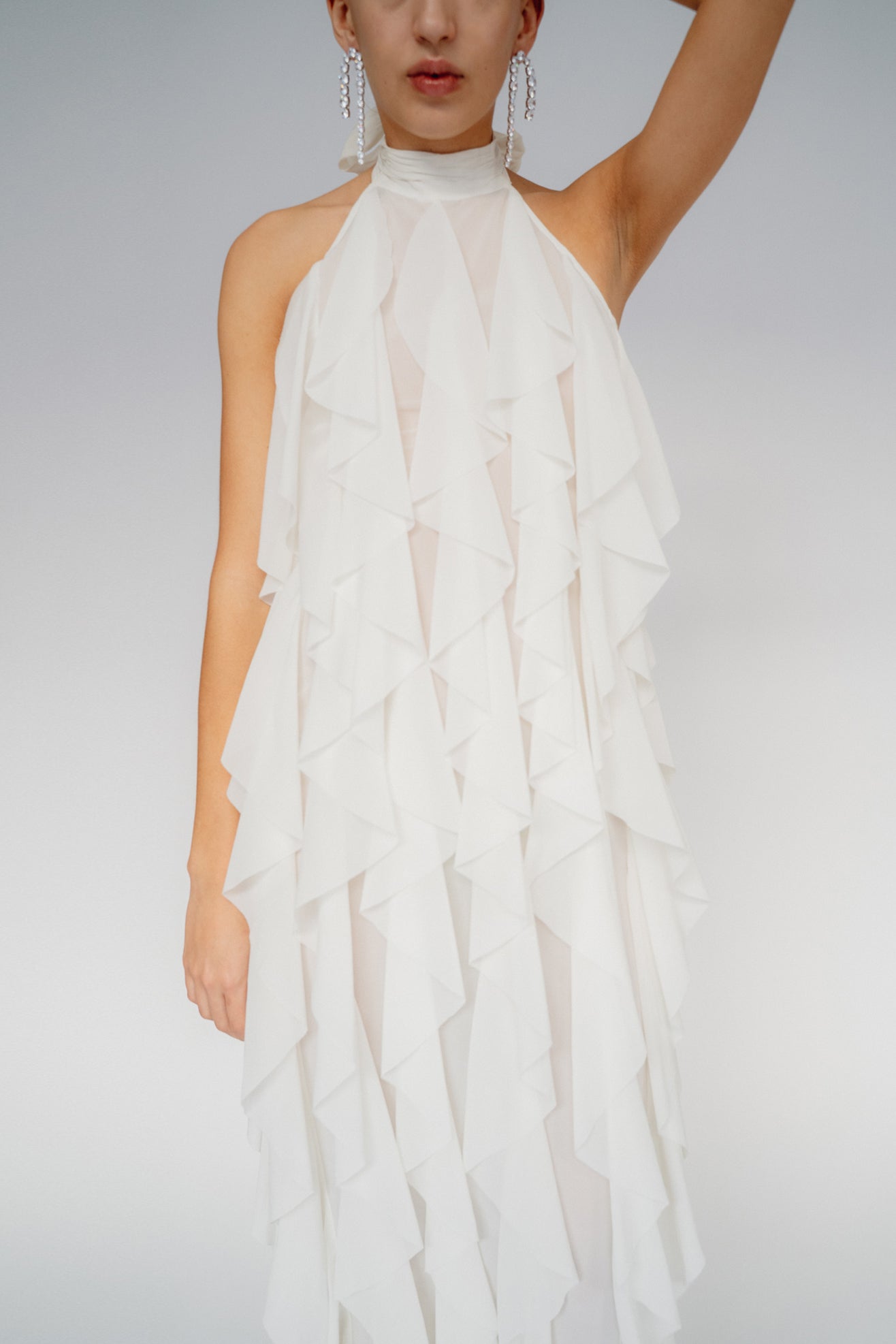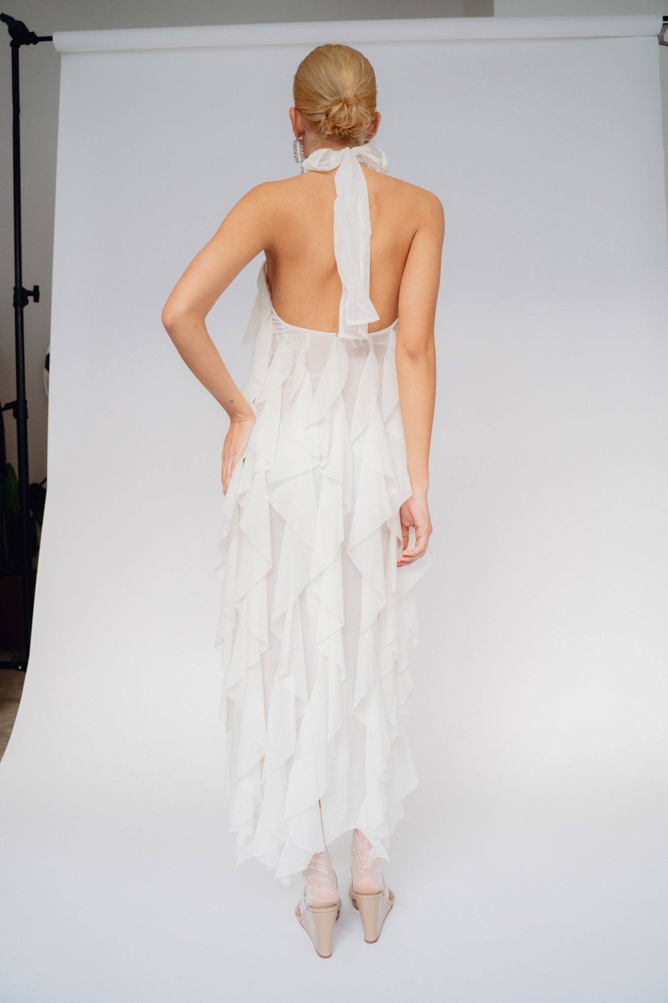 Maxi dress with ruffles in cream/white Silk-blend. Halter neck with tie closure and open back. Button closure at back. Hem split at back. Fully lined.