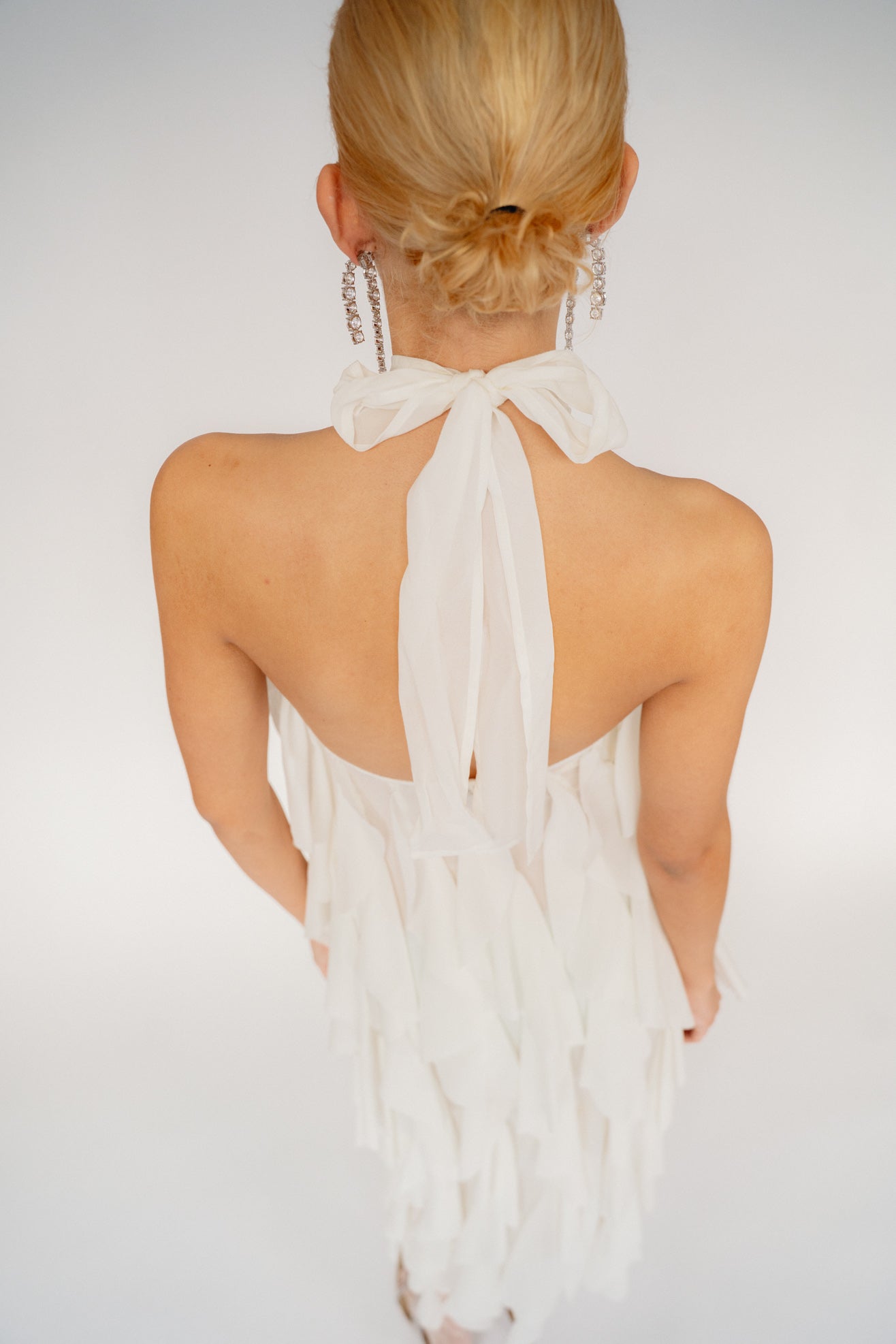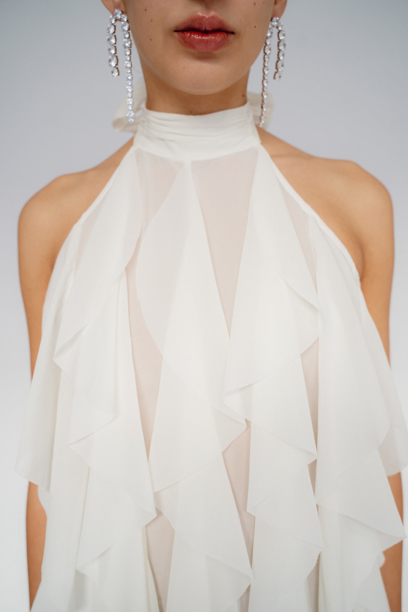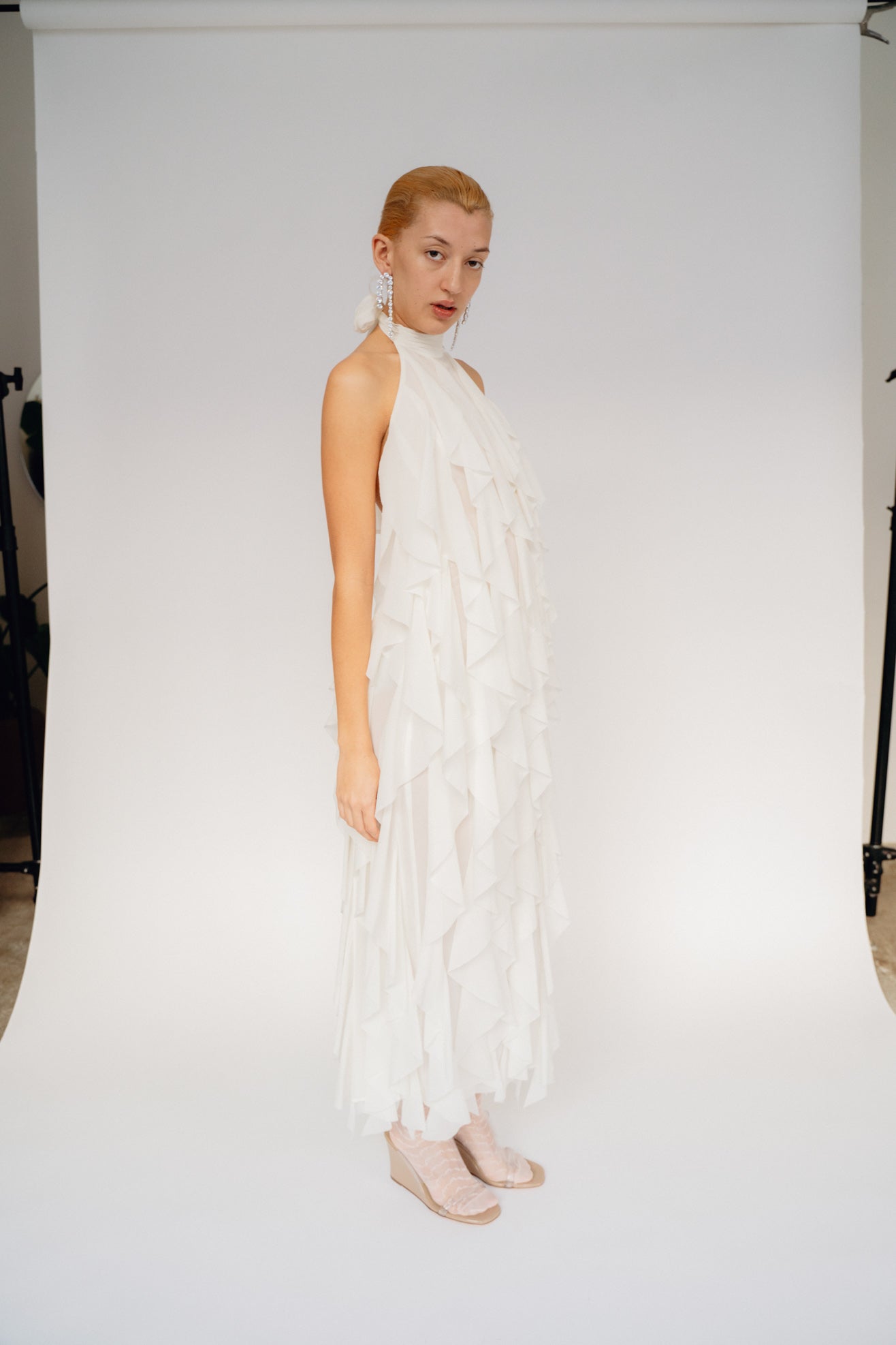 Maxi dress with ruffles in cream/white Silk-blend. Halter neck with tie closure and open back. Button closure at back. Hem split at back. Fully lined.