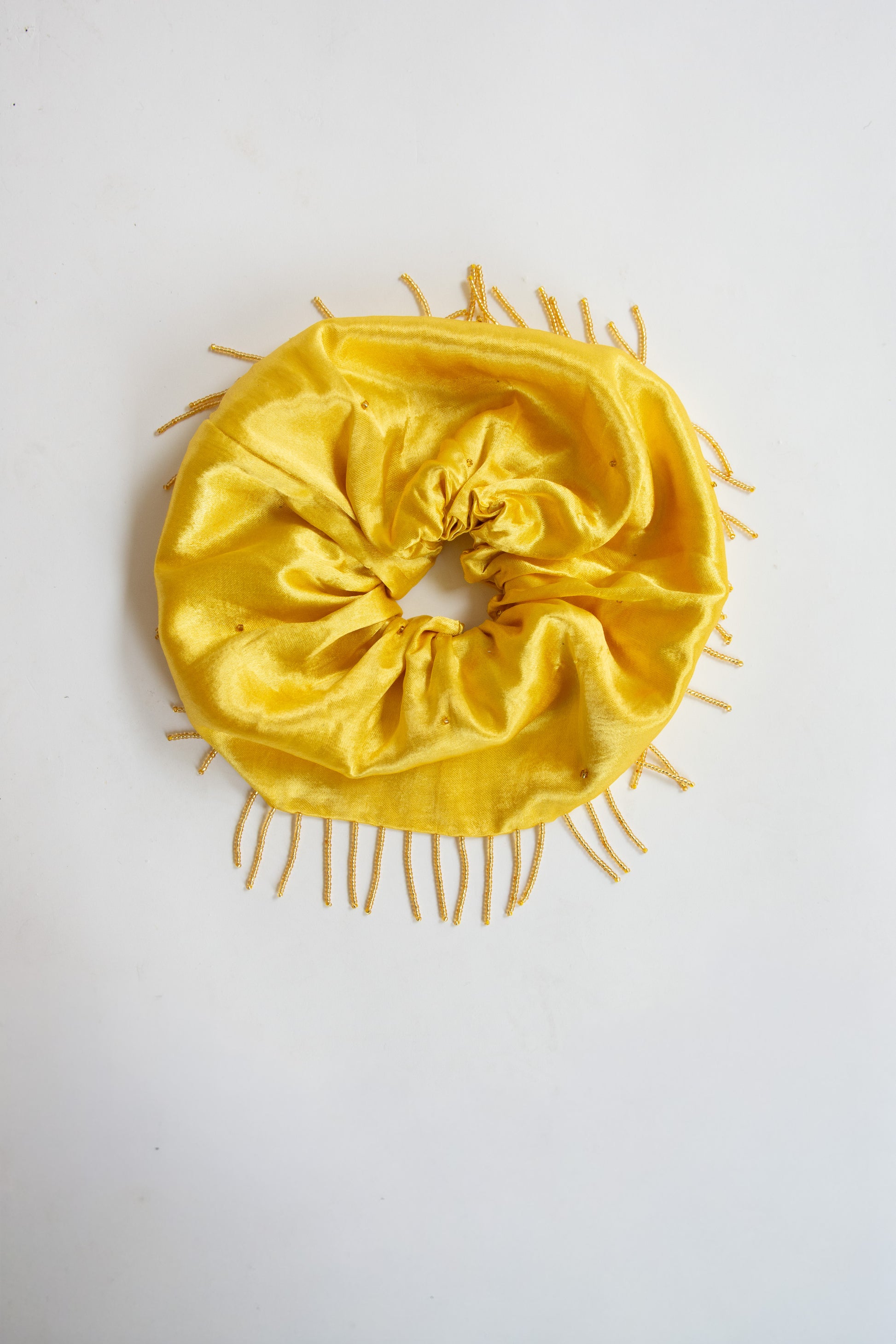 Extra large hair scrunchie in yellow silk mashroo with tonal beading and yellow beaded trim. Can be worn as a hairpiece or armband.