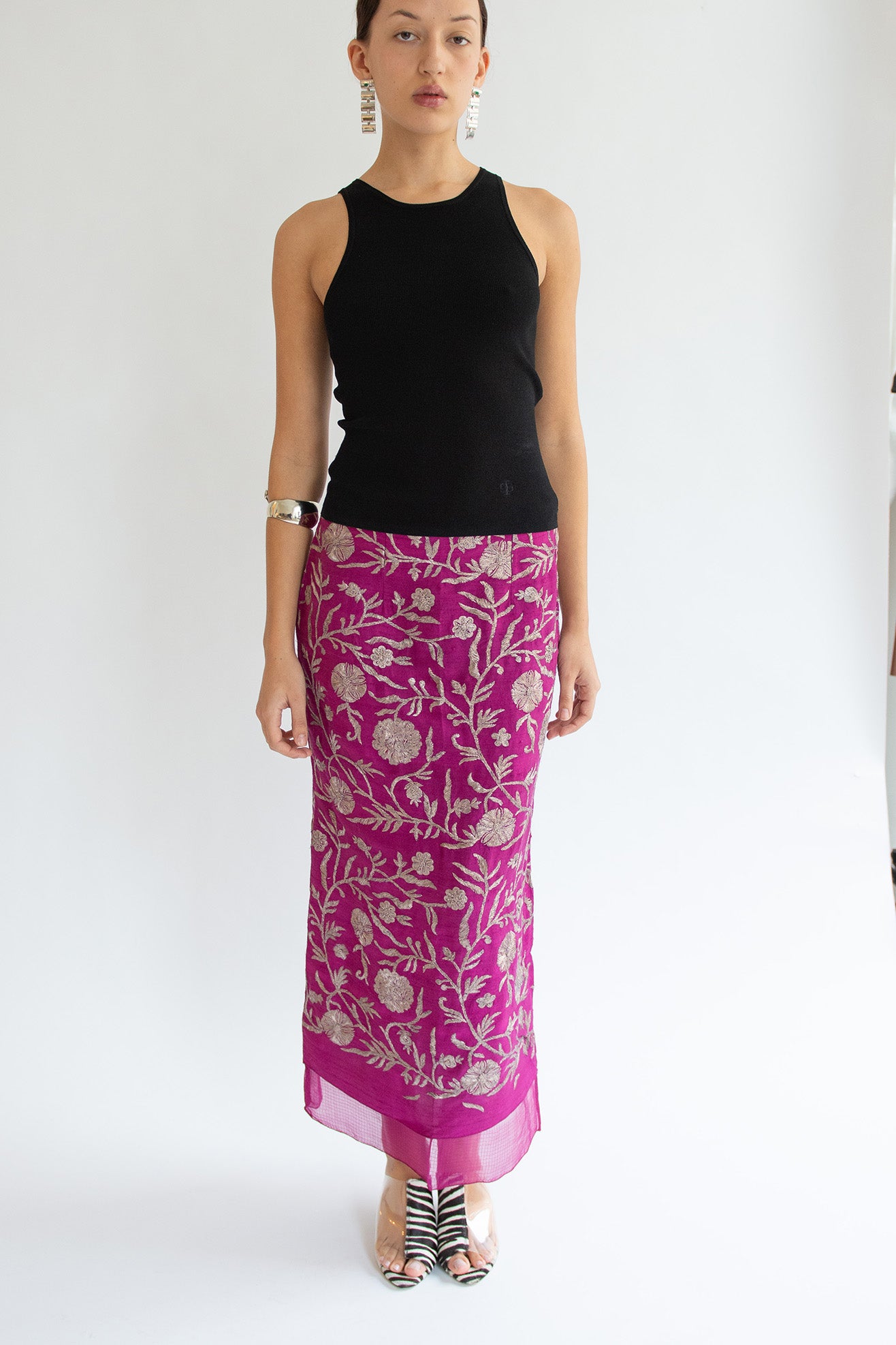 Straight, layered skirt in magenta kota silks with hand embroidered silver floral motif in metal threading. Sheer chiffon visible underlayer detail at hem. Side slit at left hem. Invisible zipper closure at side seam.