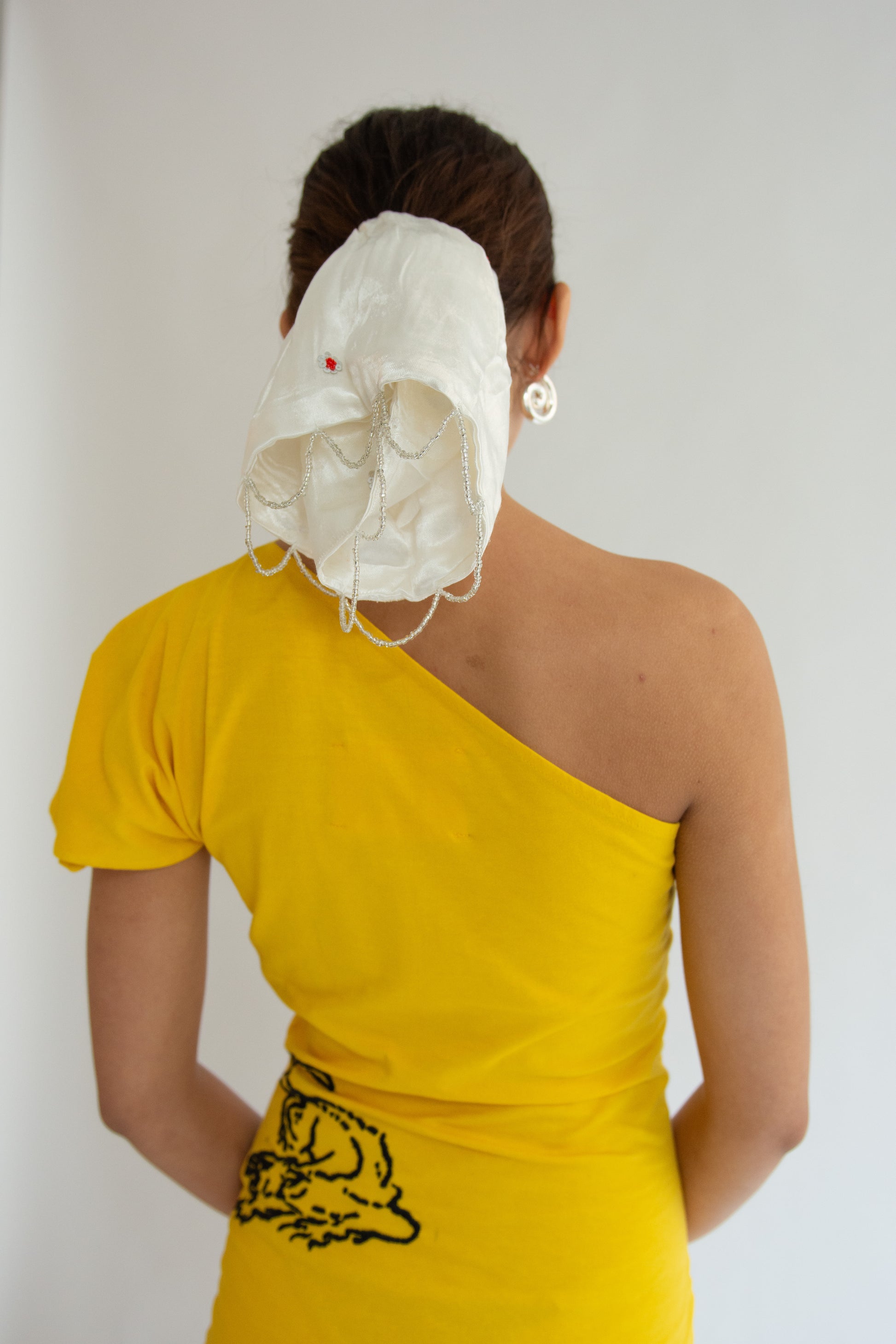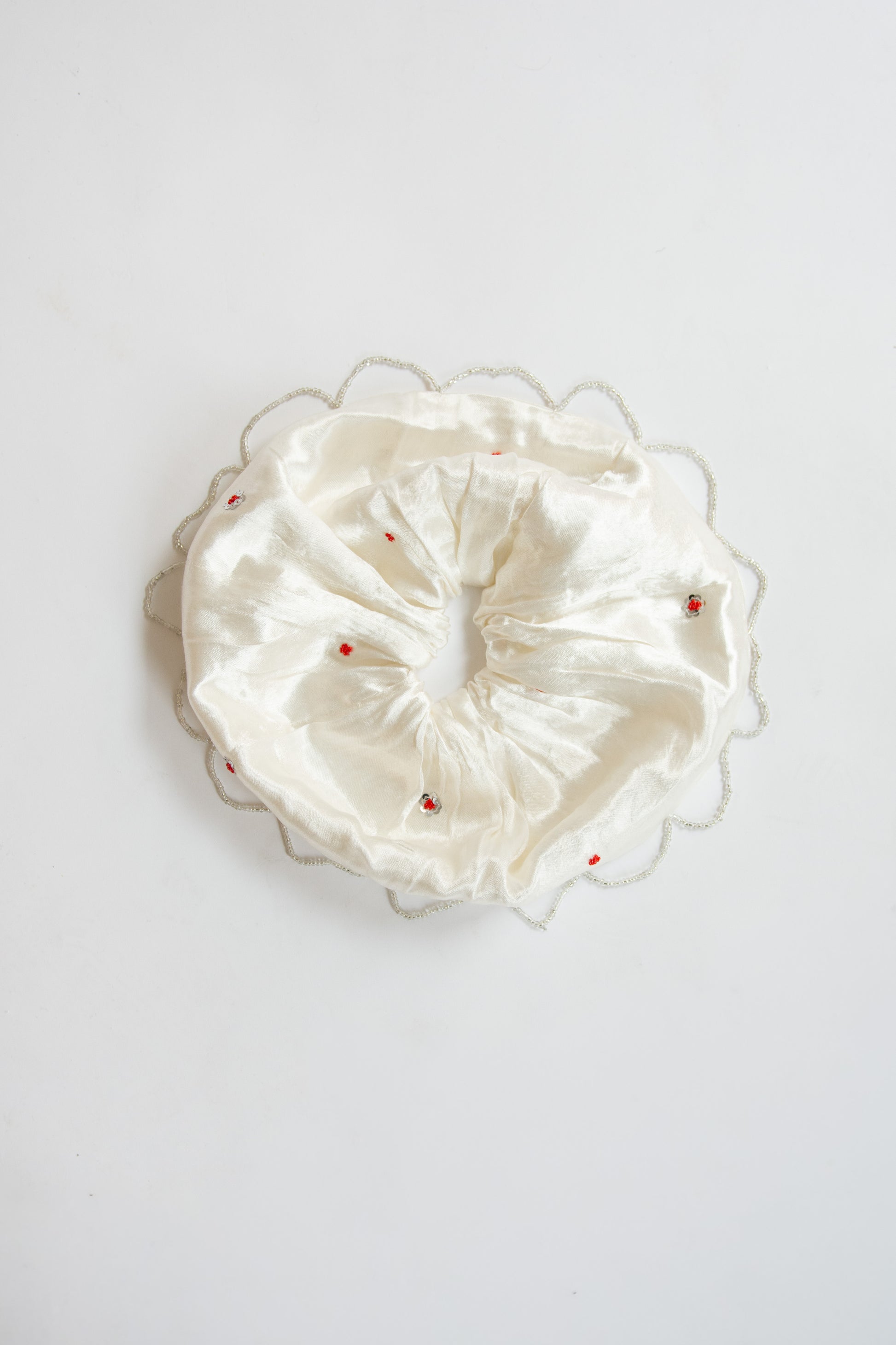 Extra large hair scrunchie in white silk mashroo with red & silver floral beading and cascading white beaded trim. Can be worn as a hairpiece or armband.