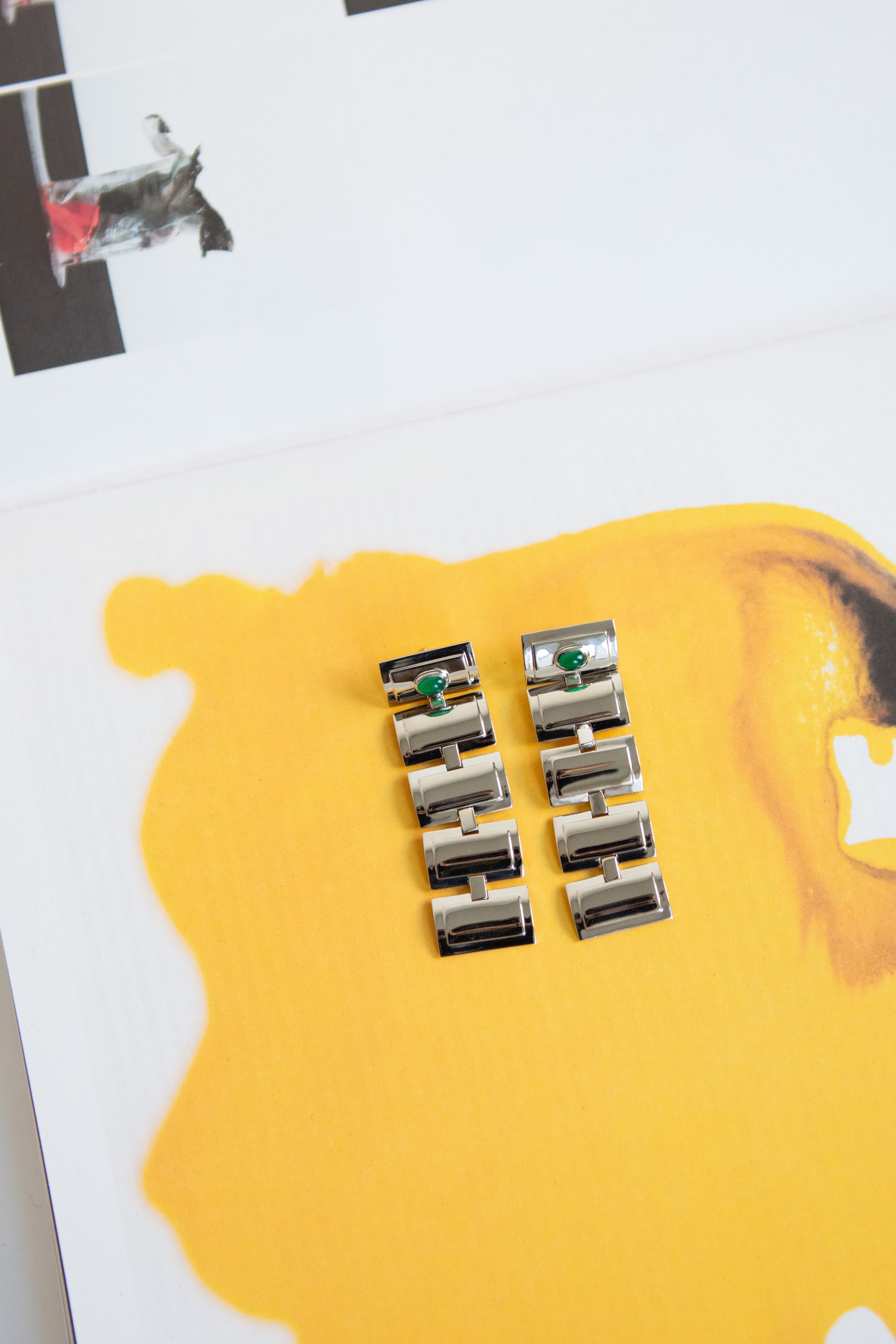 Earring in brass with platinum finish. Rectangular links connect each element. Green Agate set at center. Post back for pierced ears.