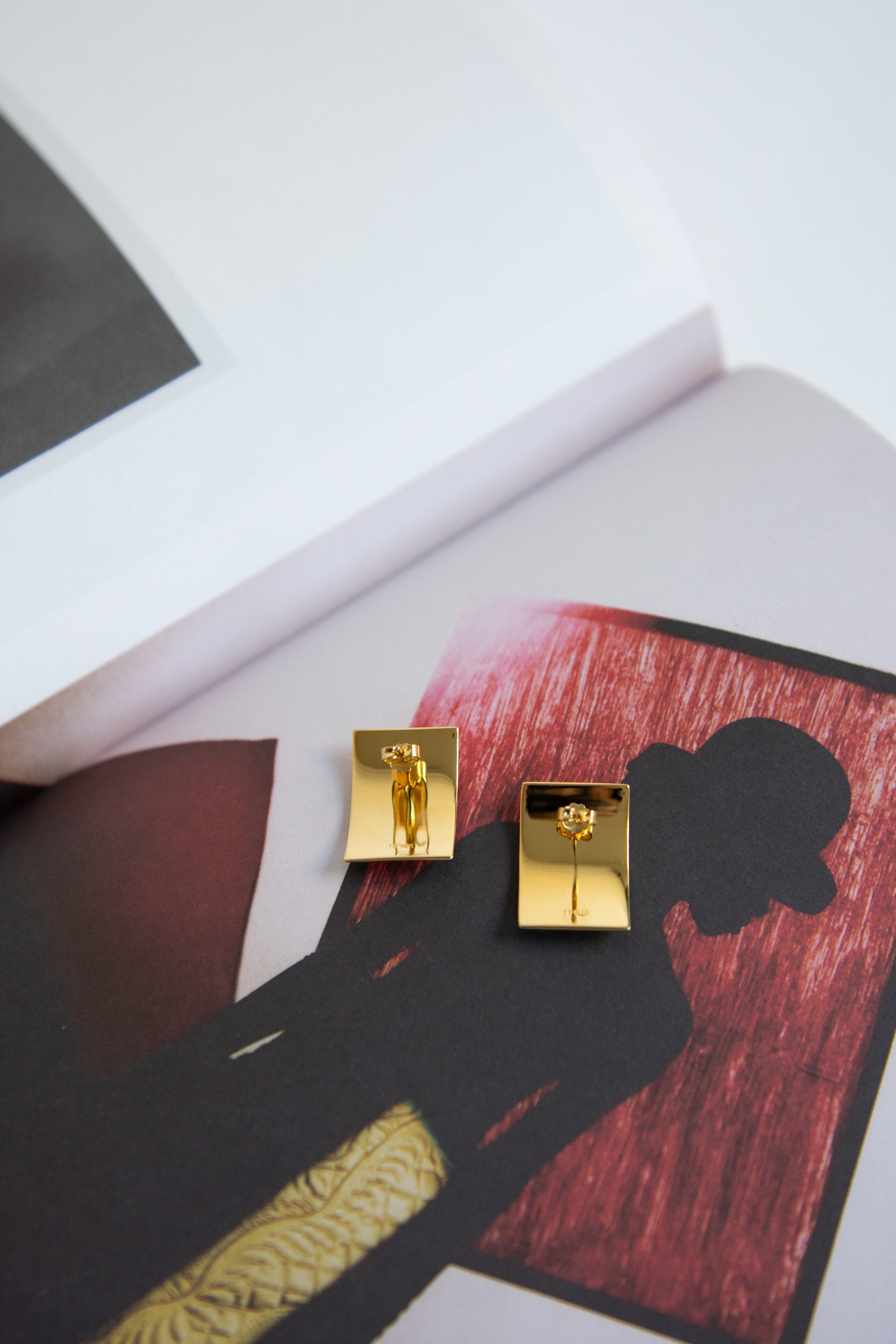 Earring in 925 sterling silver with 14k gold-plated finish. Curved and layered shape. Post back for pierced ears.