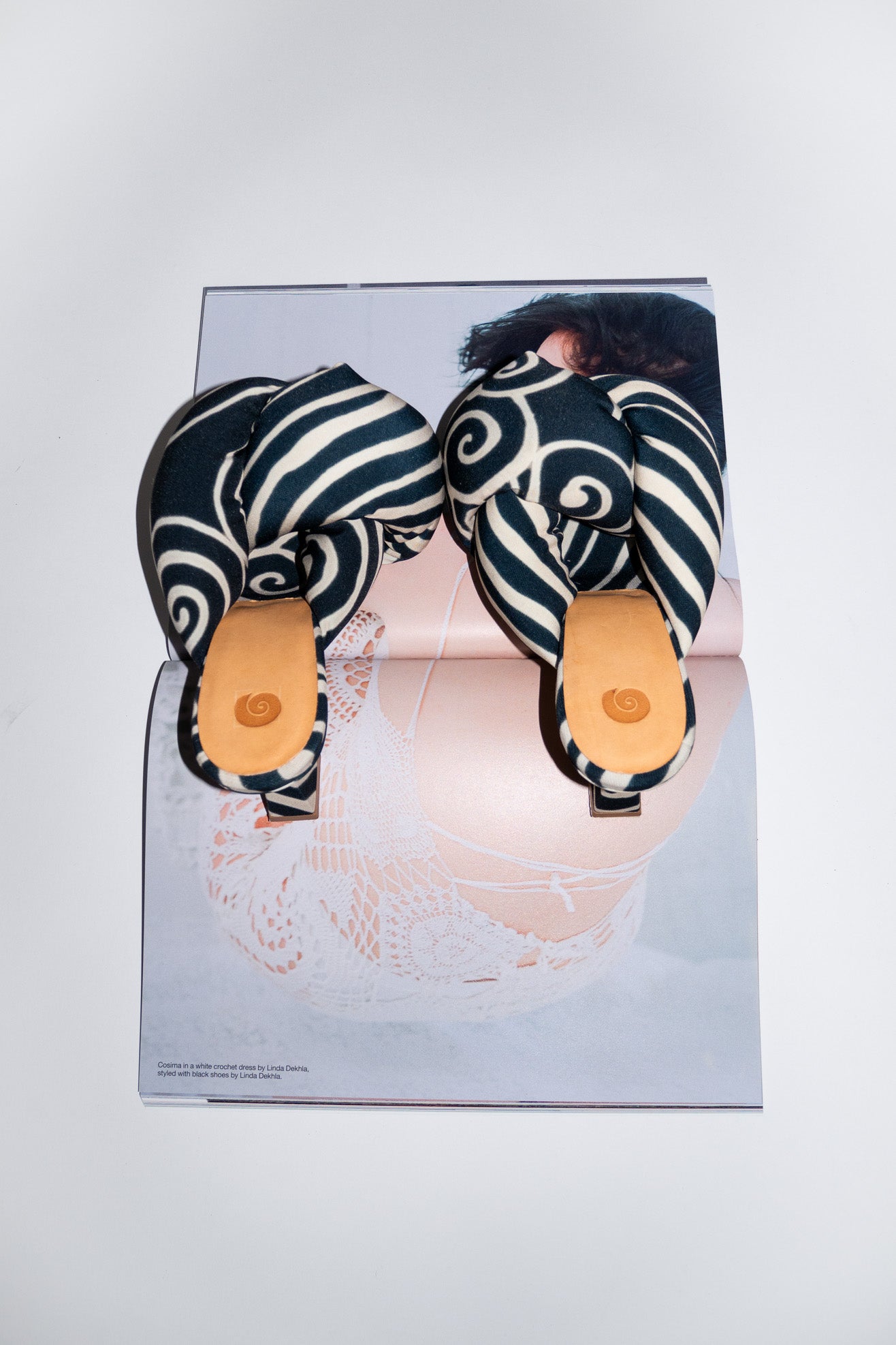 Squared toe mule shoes made in black/cream recycled hand printed swirl fabric. Features a large padded knot. Heel 7 cm. Shoe made from recyclable materials.
